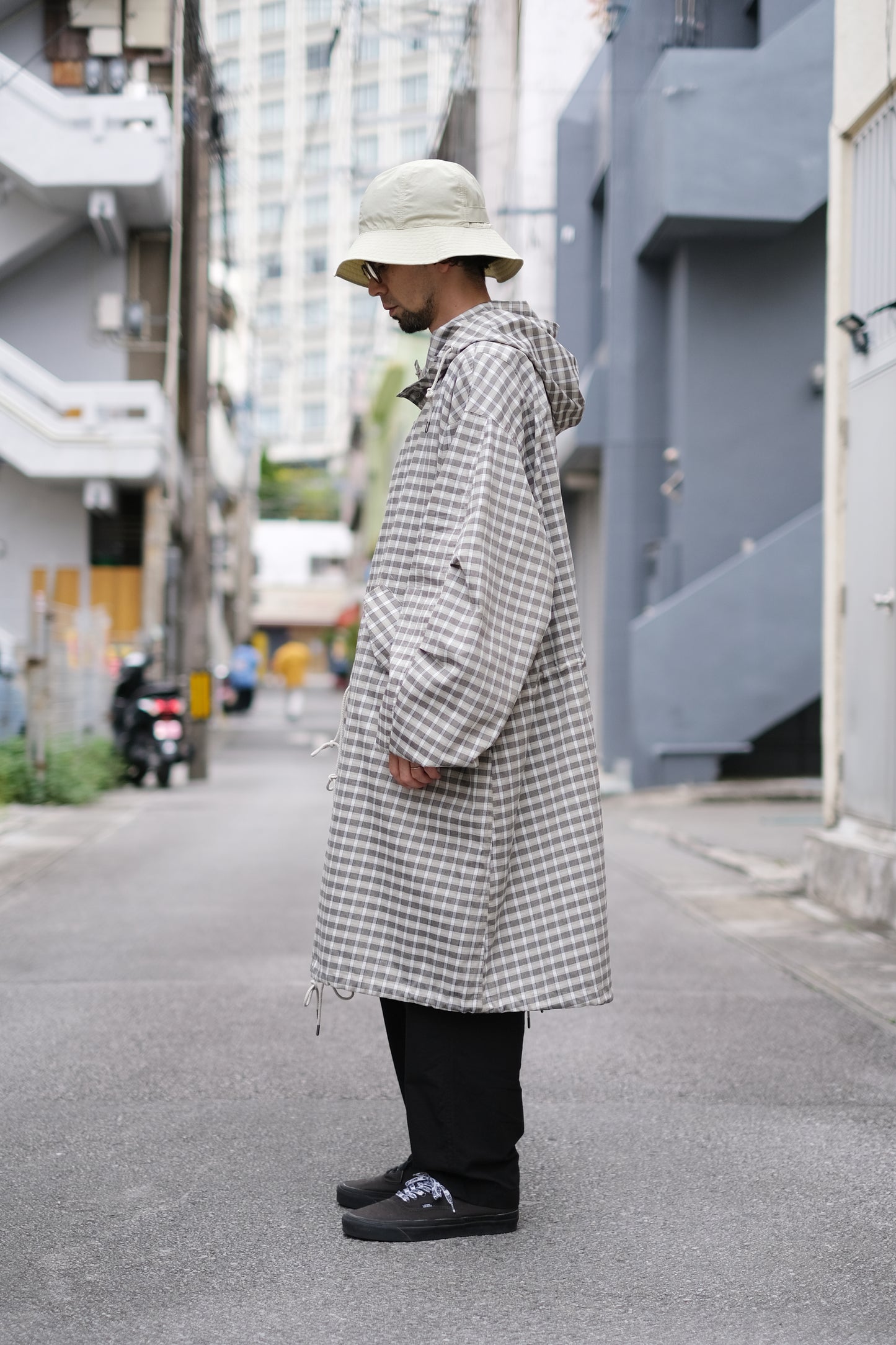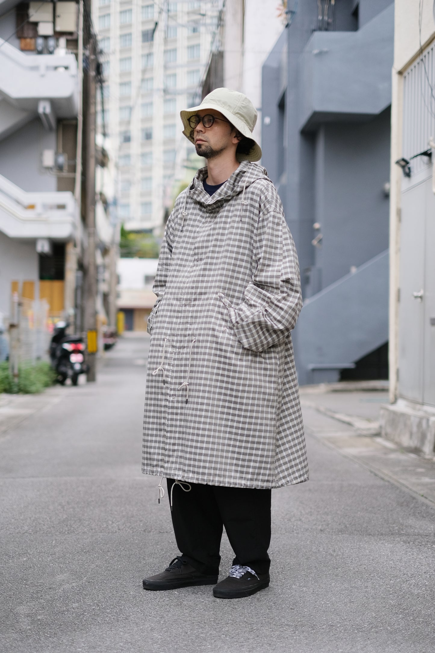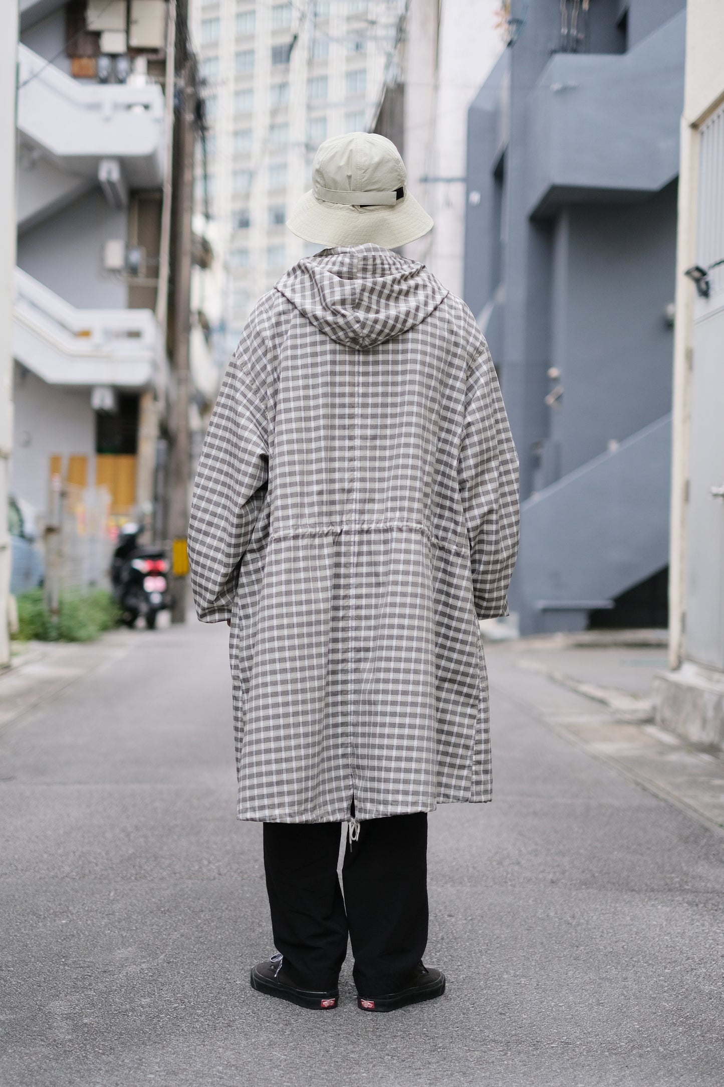 新型となるオーバーパーカーです。スノーパーカーをベースに、一枚仕立てで魅せるコートにおける布帛生地の可能性を提案。ミリタリーアイテムをダウンスペックし、出来るだけミニマルにすることで、日常着として扱いやすいアイテムに仕上げました。ウエスト、裾にコードを通し、シルエット調整を可能にしています。袖口はゴム入りなので、ワンサイズ展開ですが、どなたでも着用できる一着になっています。前開きは軽量化、着方のアレンジを高めるために、ドットボタンを採用しています。