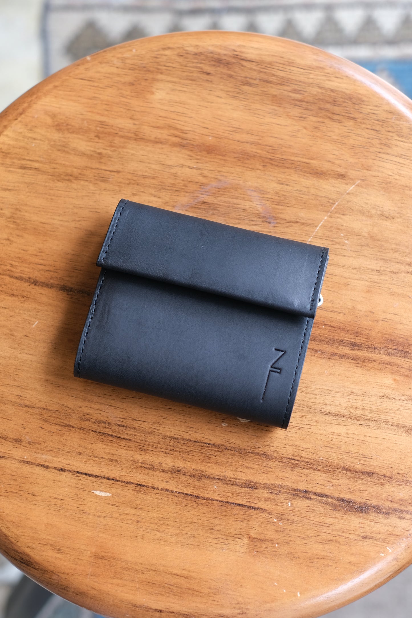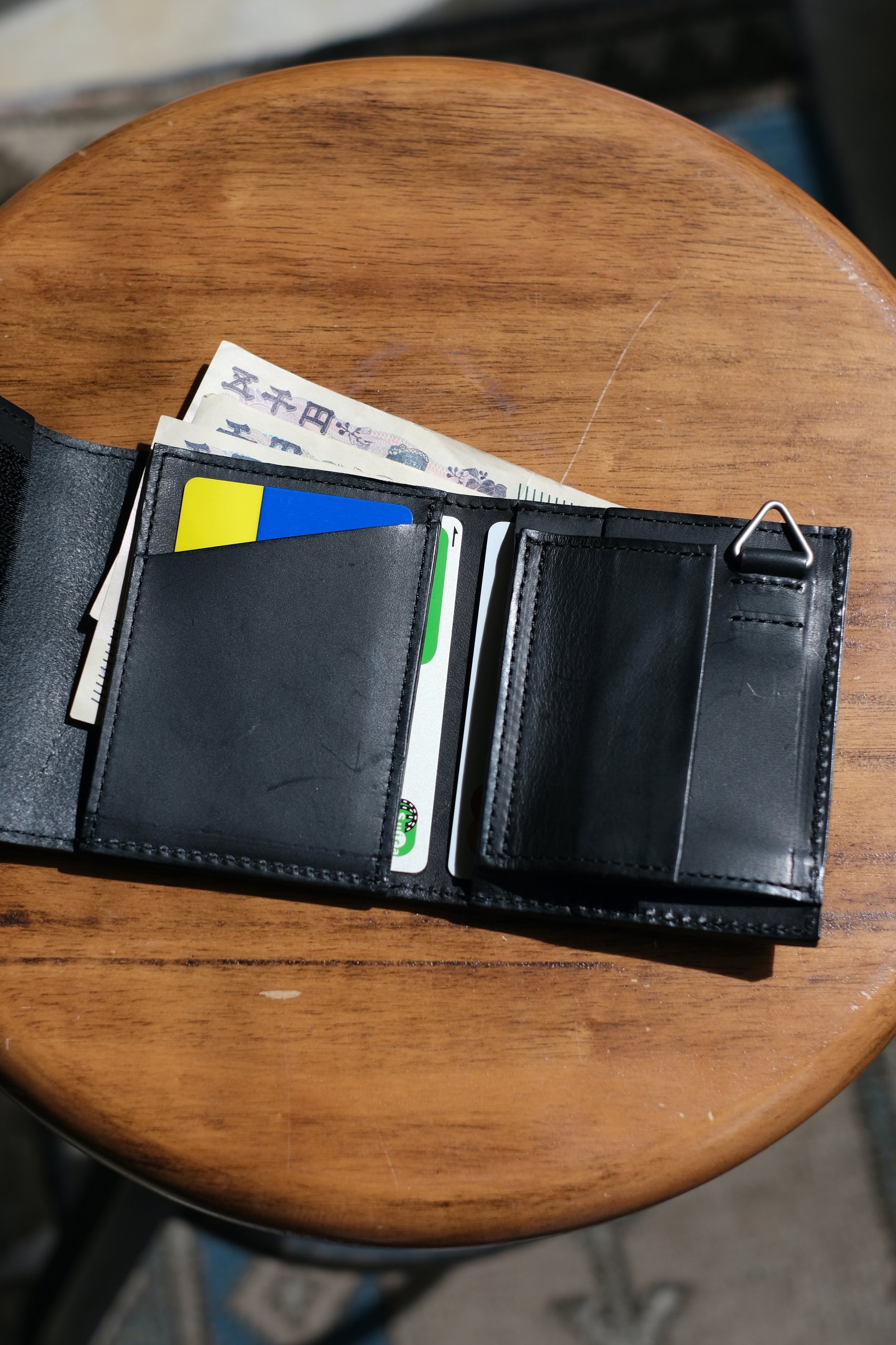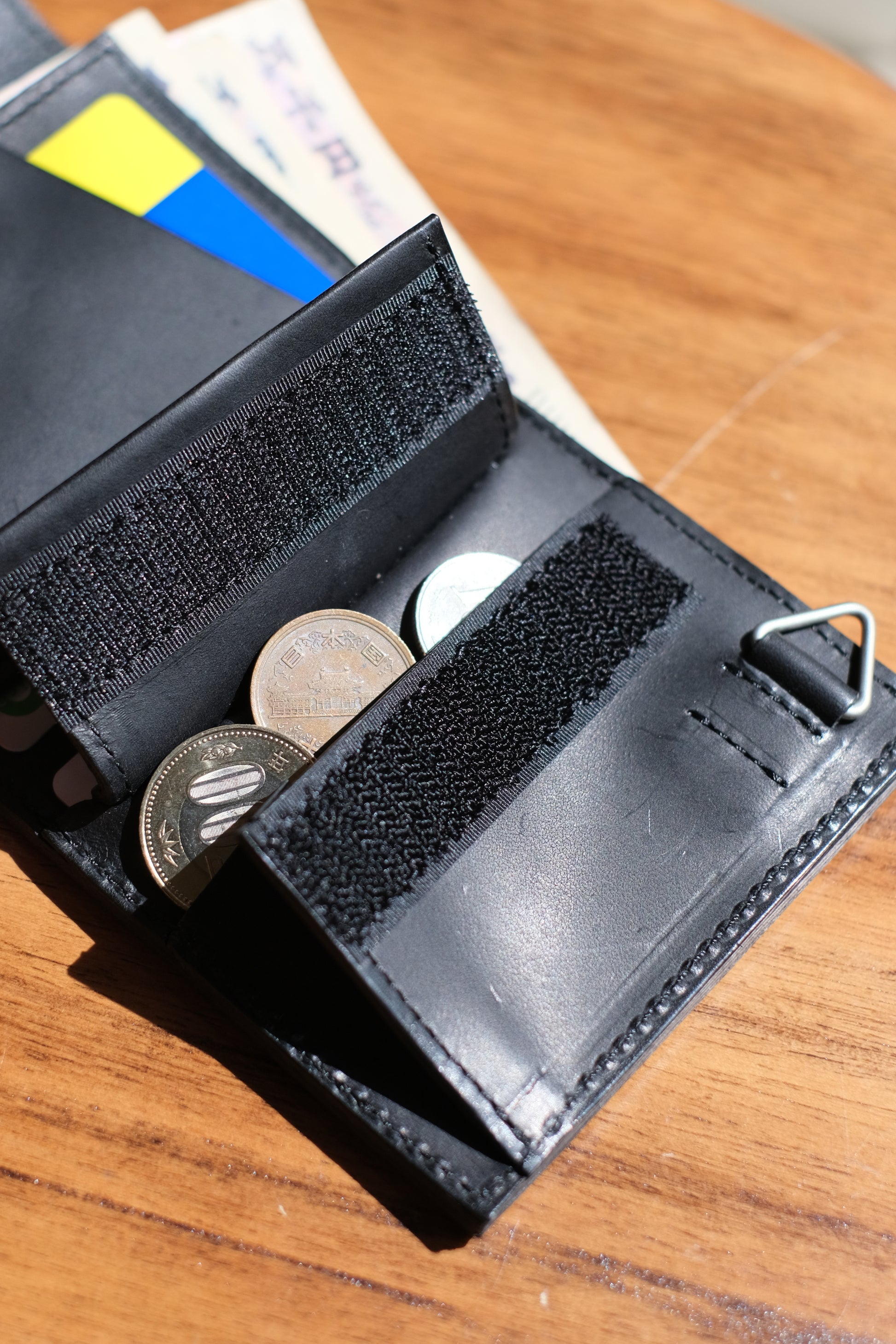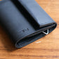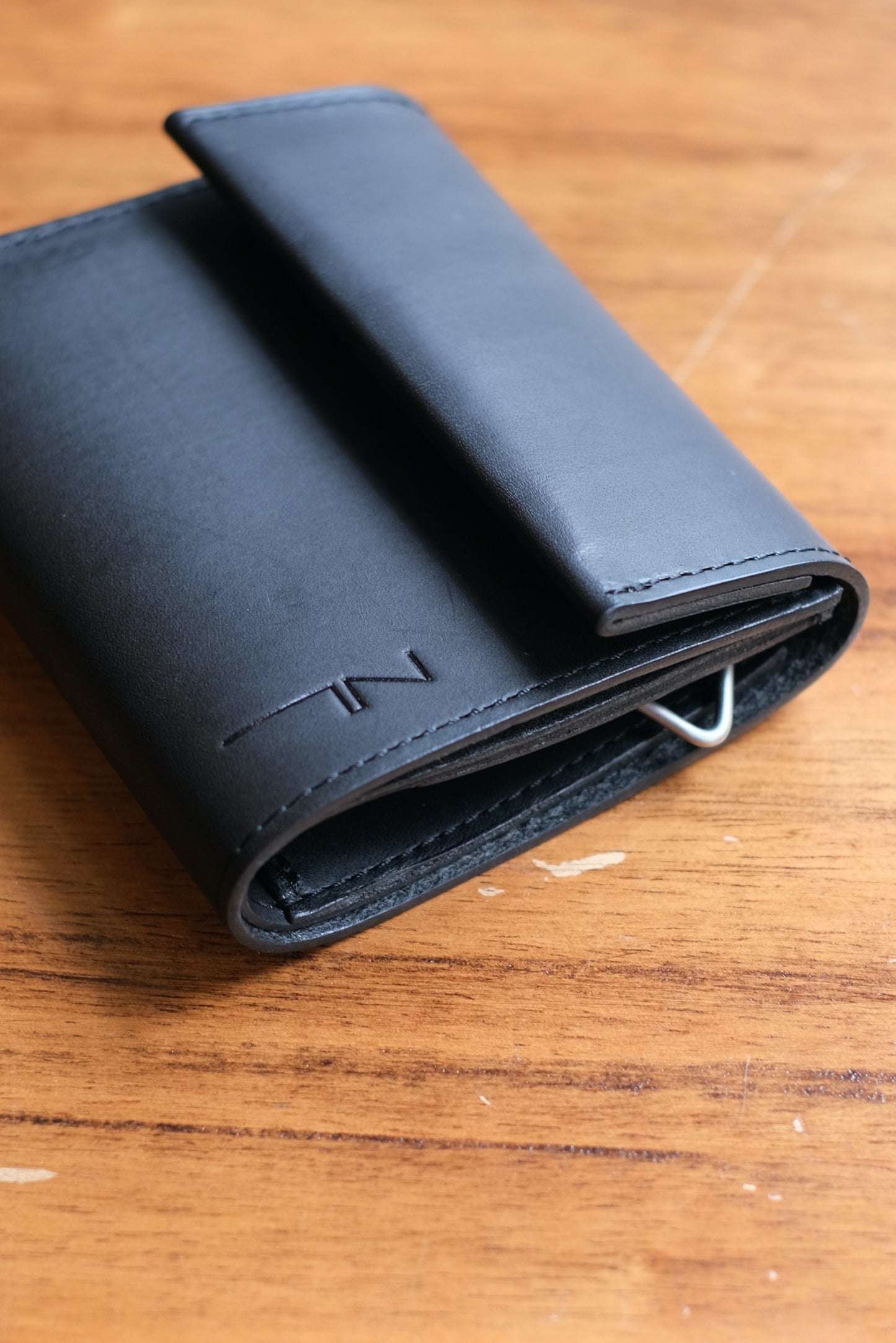 NL's L-shaped wallet, Cyril. It is designed with ease of use in mind, and you can access your bills, coins, and cards just by opening the zipper. What makes it different from other L-shaped wallets is that it has a gusset. This increases the storage capacity for coins and prevents the wallet from becoming too full. There is also a square ring on the bottom side where you can attach a wallet chain. Another feature of this wallet is the aging of the leather, which becomes more comfortable as you use it.
