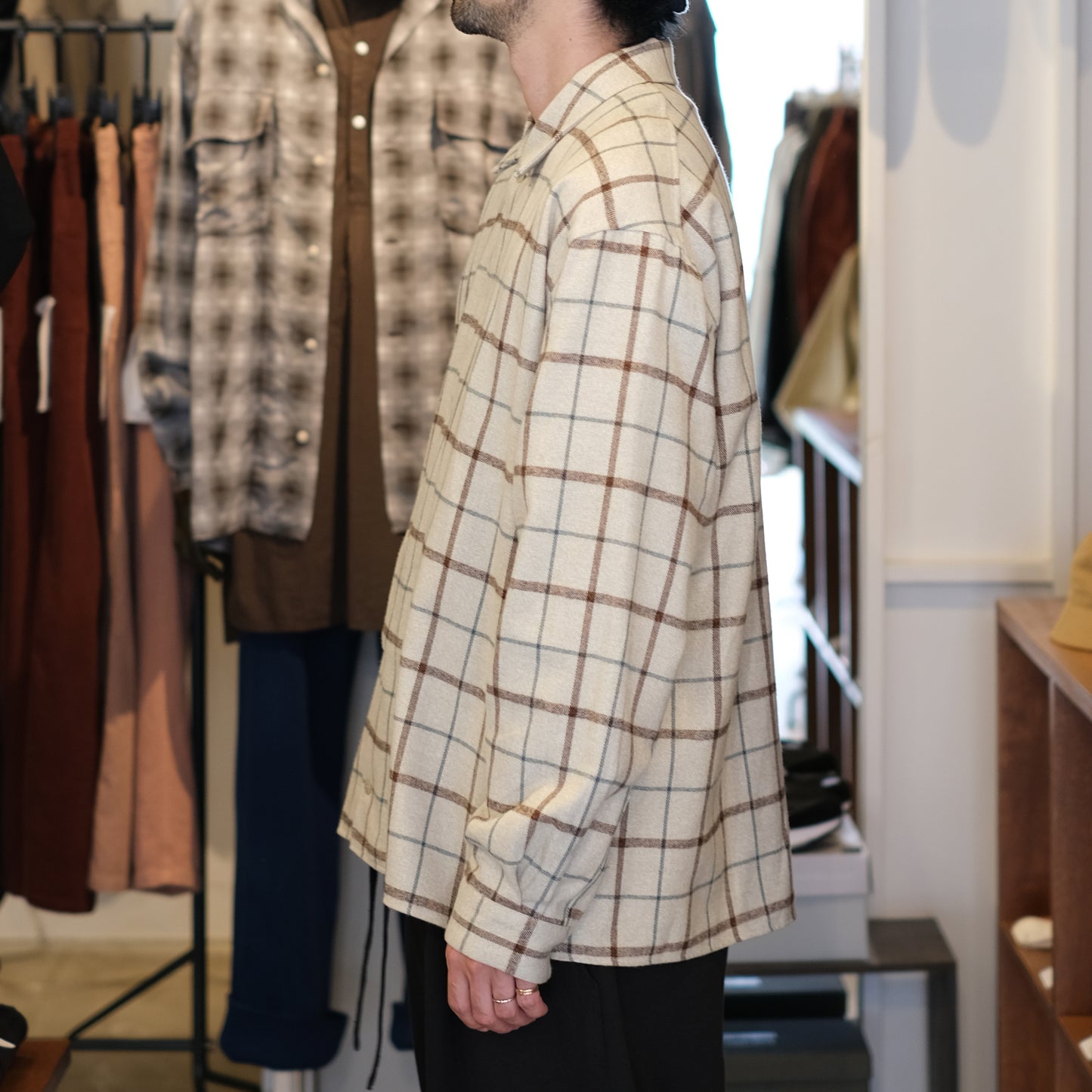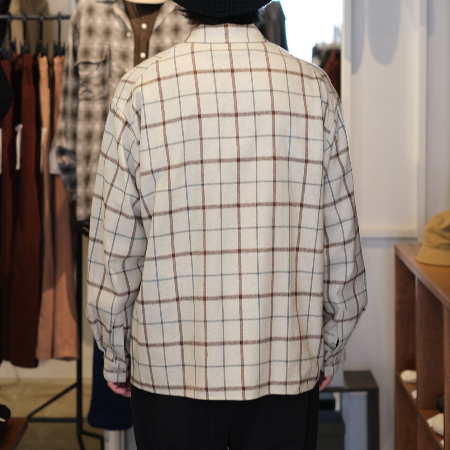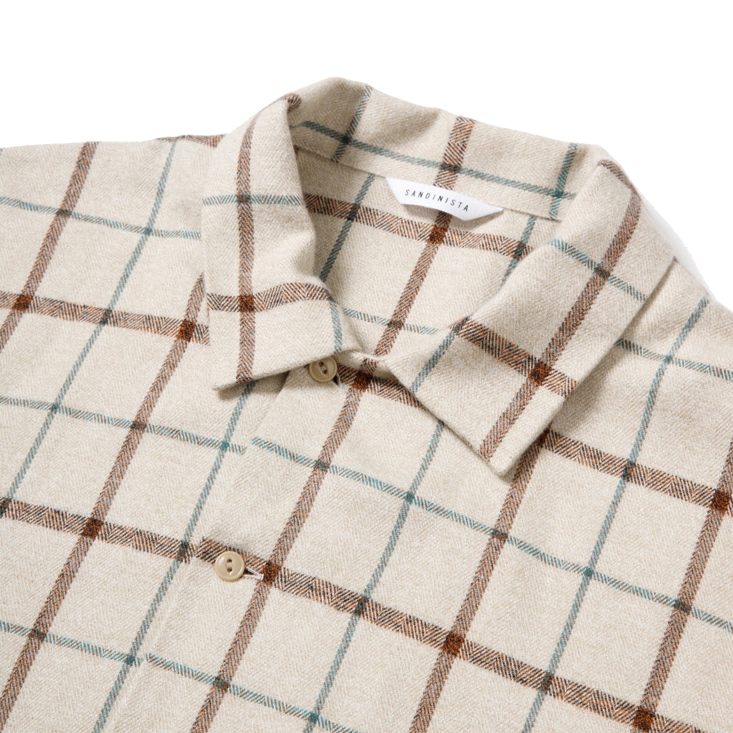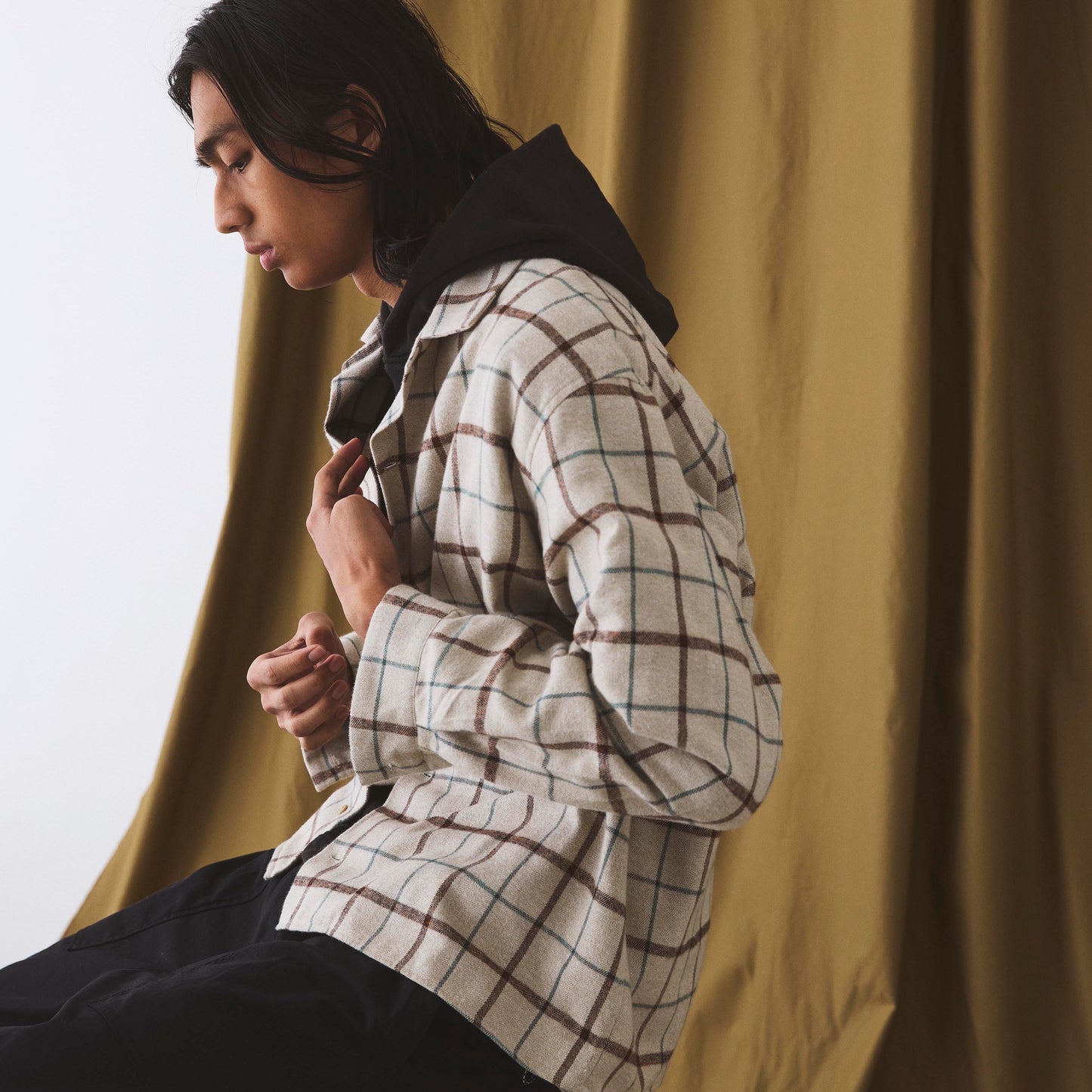 This melange check shirt is made with twisted heathered cotton yarn . The design is characterized by the slightly shifted button position at the front, making it a semi-double open-neck shirt.