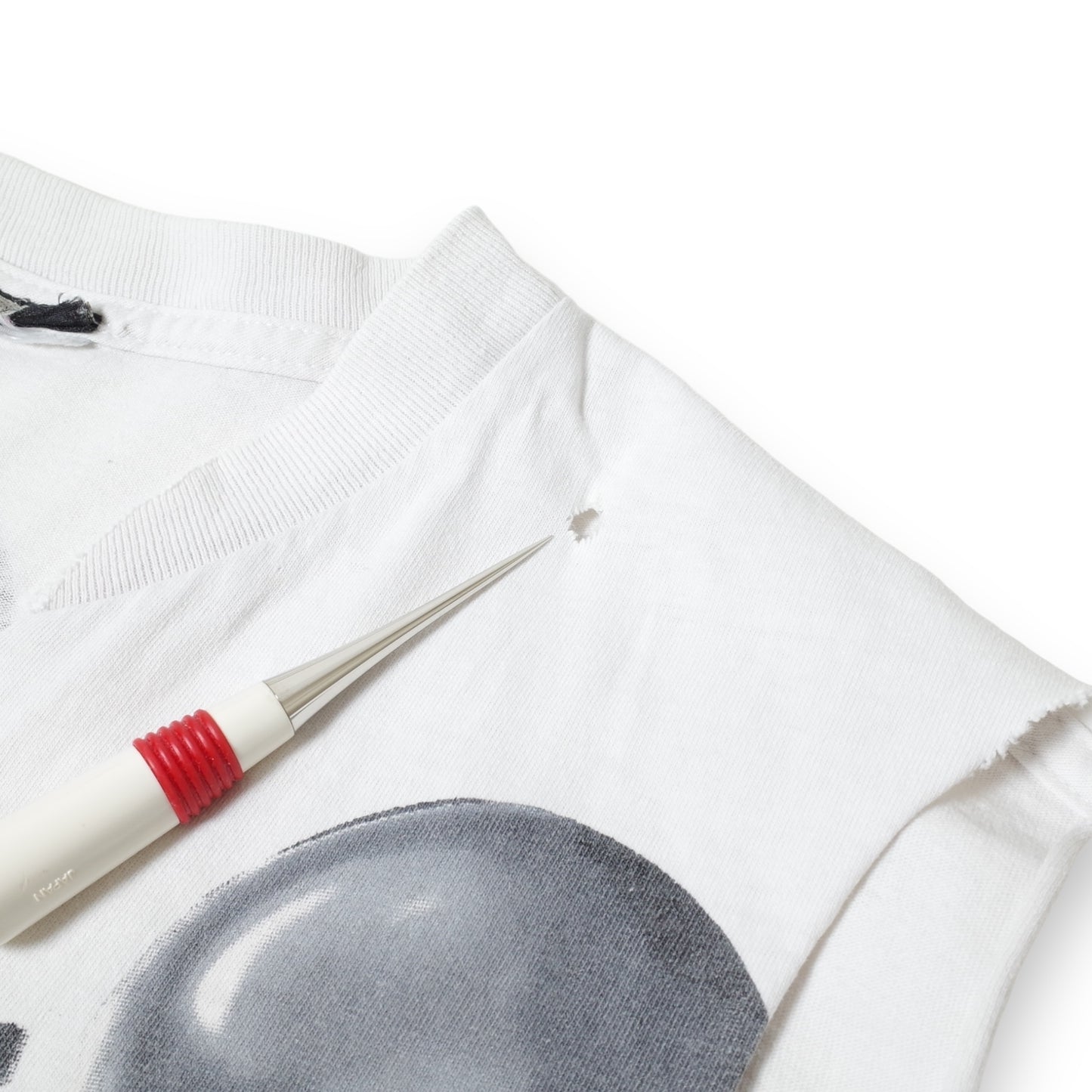 The sleeves are cut off. There is a slit at the neck. There is a hole near the left shoulder.