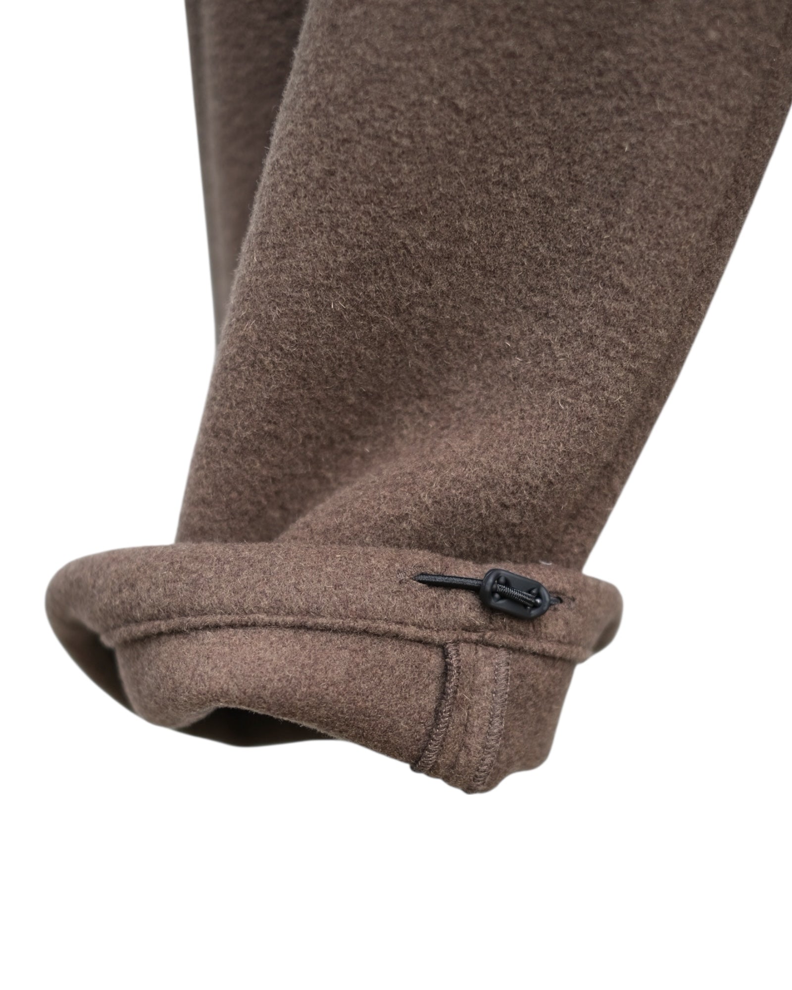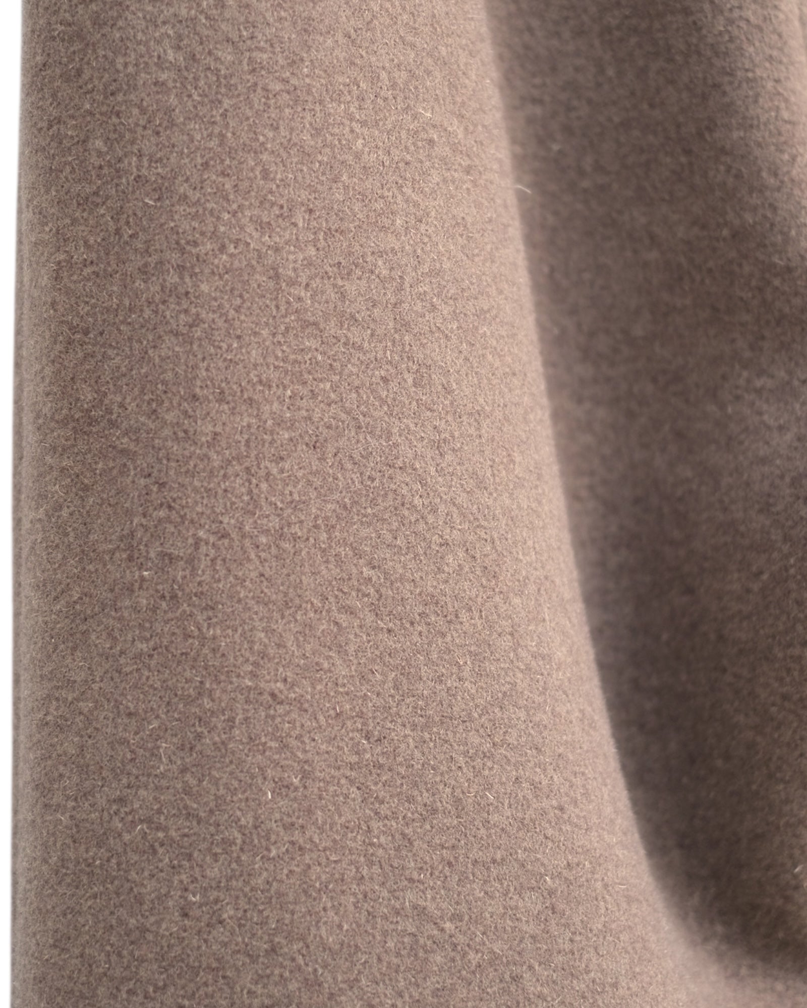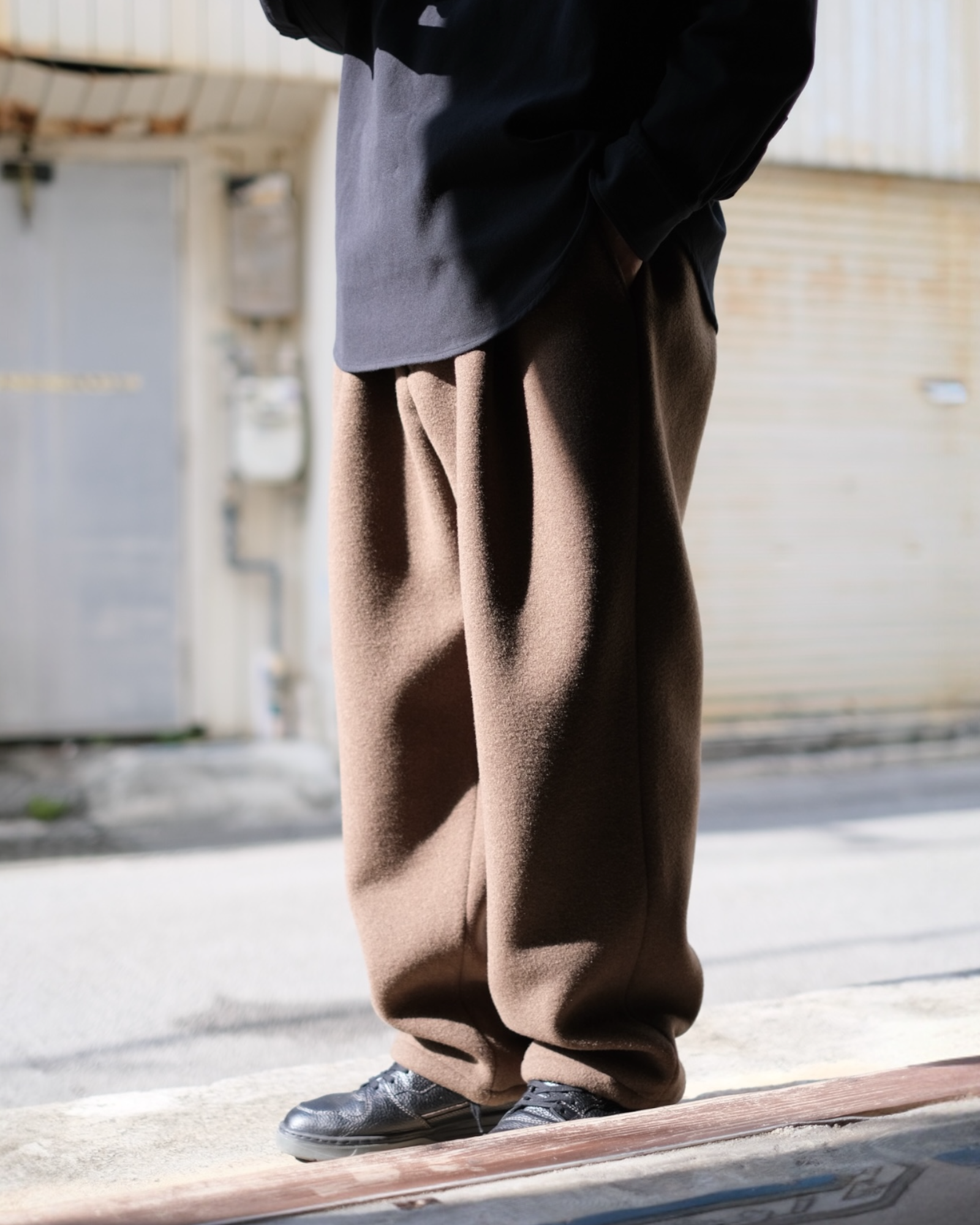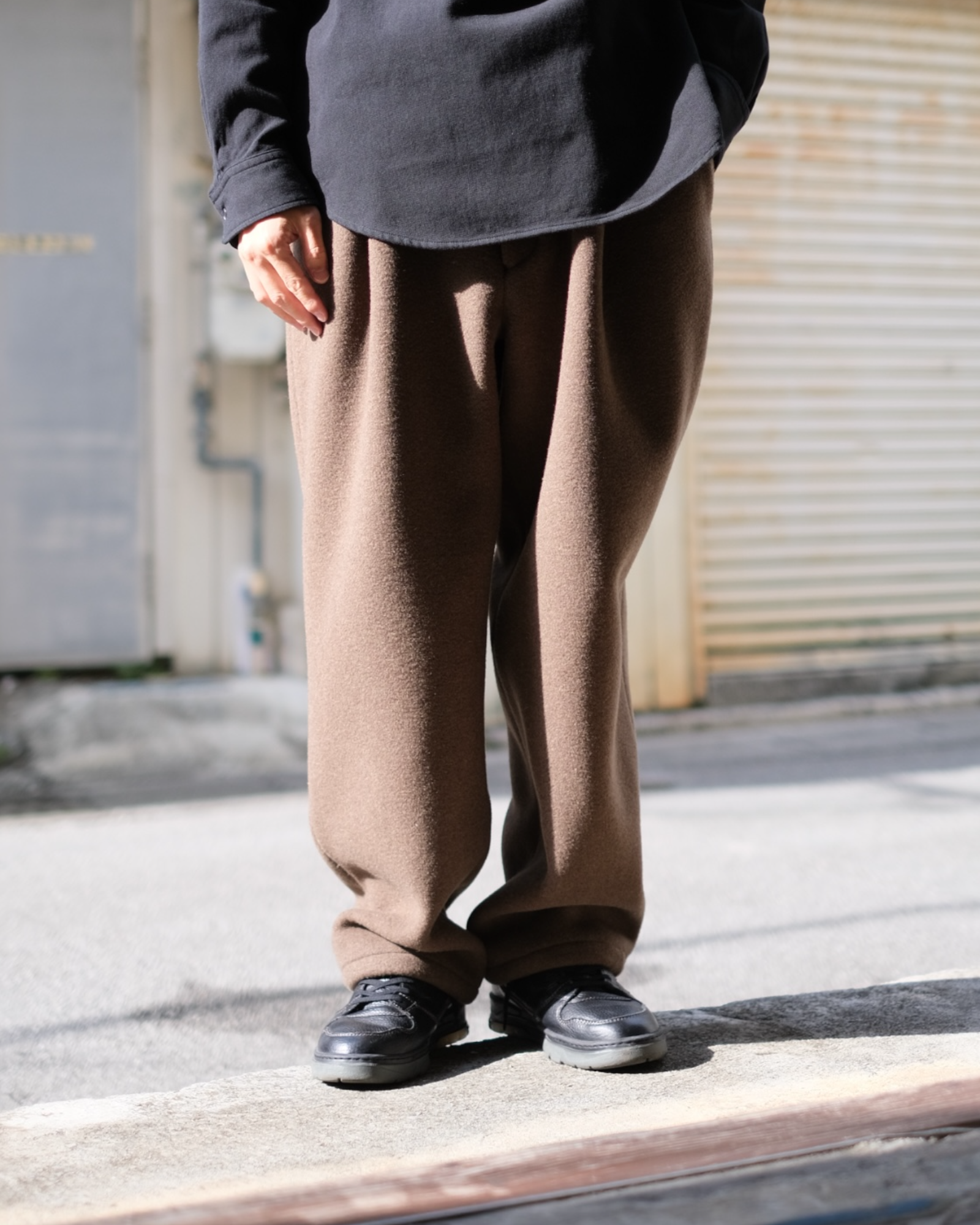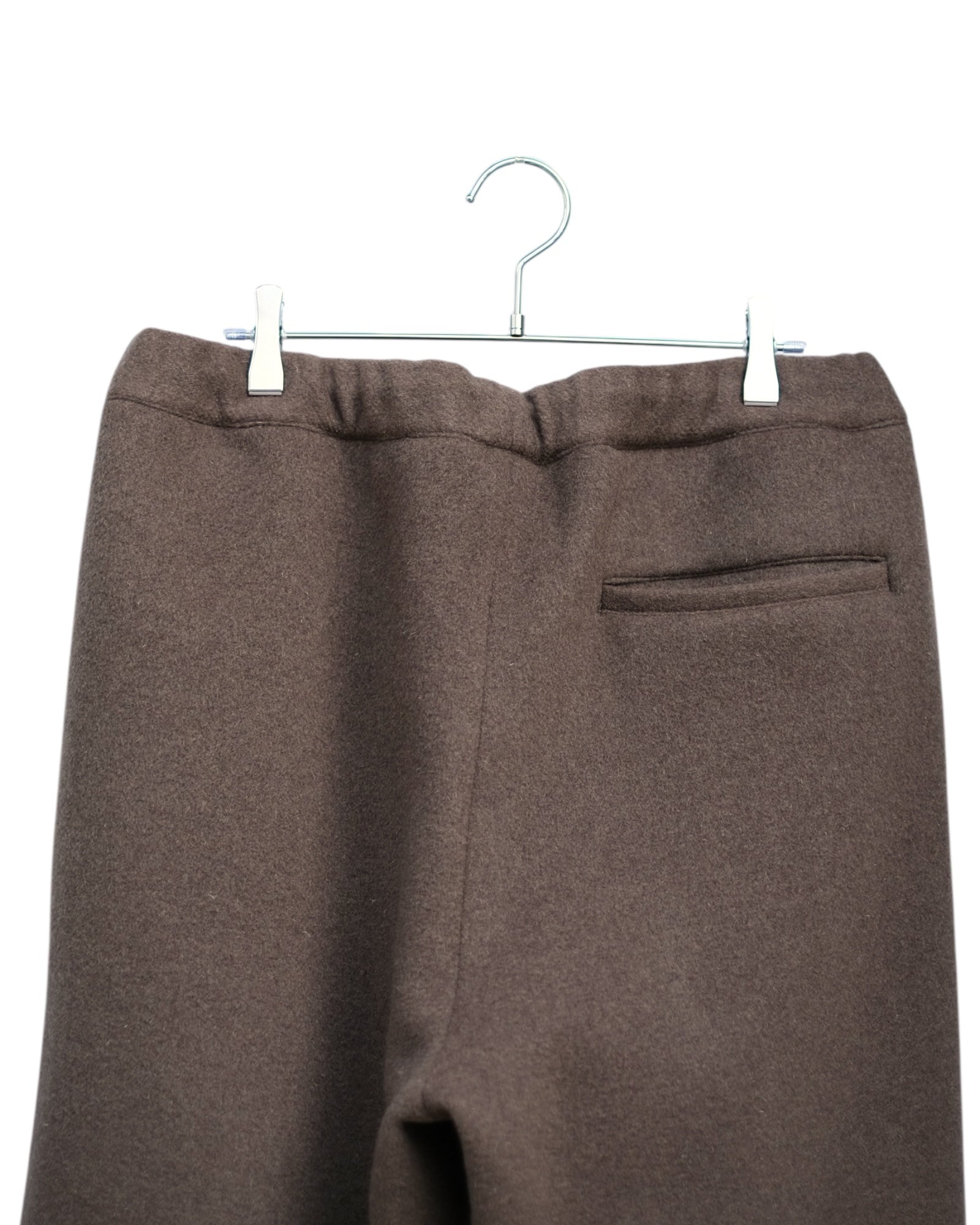 おそらくインポート生地。イタリアなどの暖かな地域の羊毛を使用したものと推測。肉厚なメルトンの中でもフリースライクな柔らかさ、軽さを持ち合わせており、カジュアルな冬用のメルトンパンツとして提案。