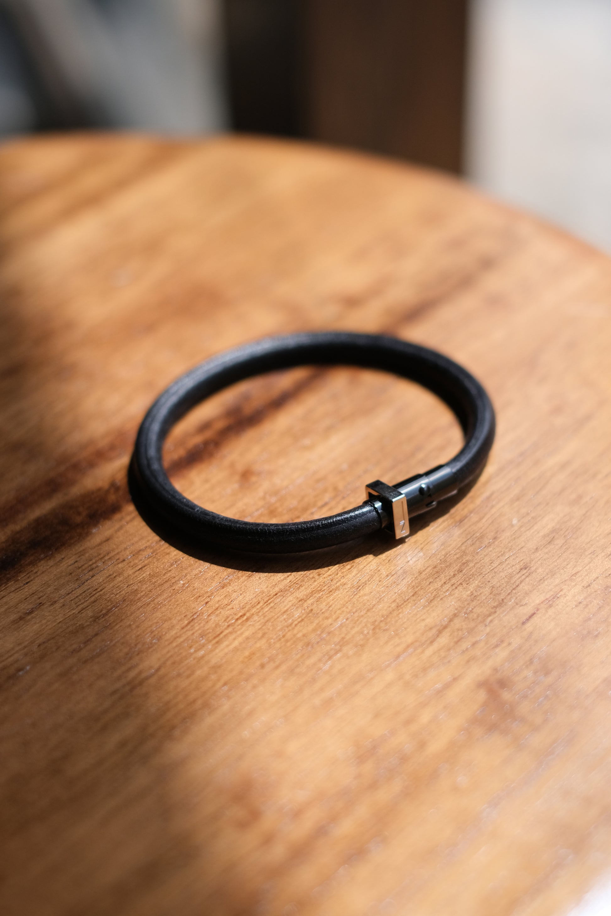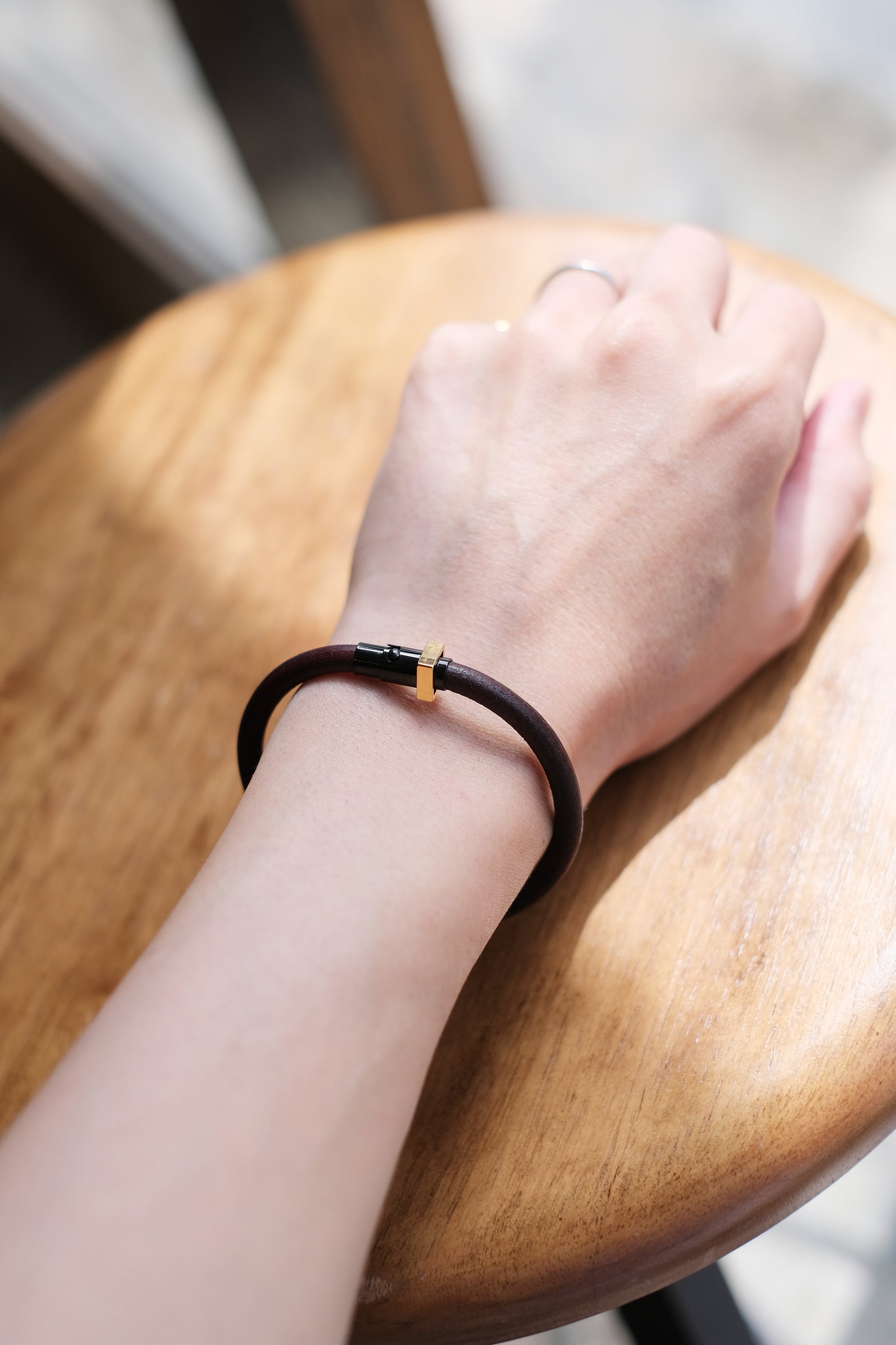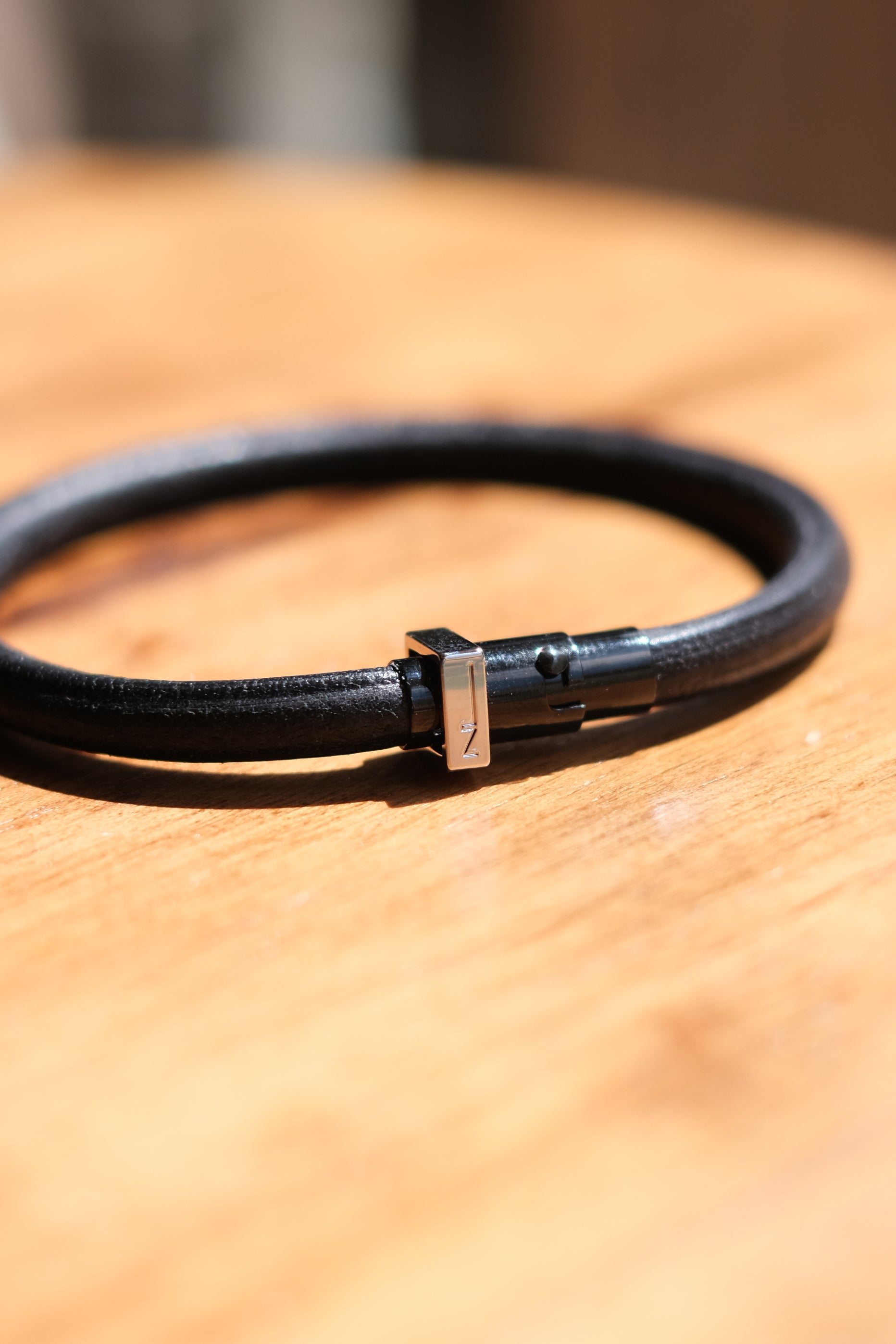 5mm幅のレザーコードを使用したレザーブレスレットです。接続部にはマグネットを用いているため着脱が容易になっています。(ひねって開閉するパーツになります) ネームパーツにNL刻印が入ります。