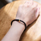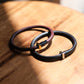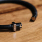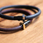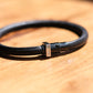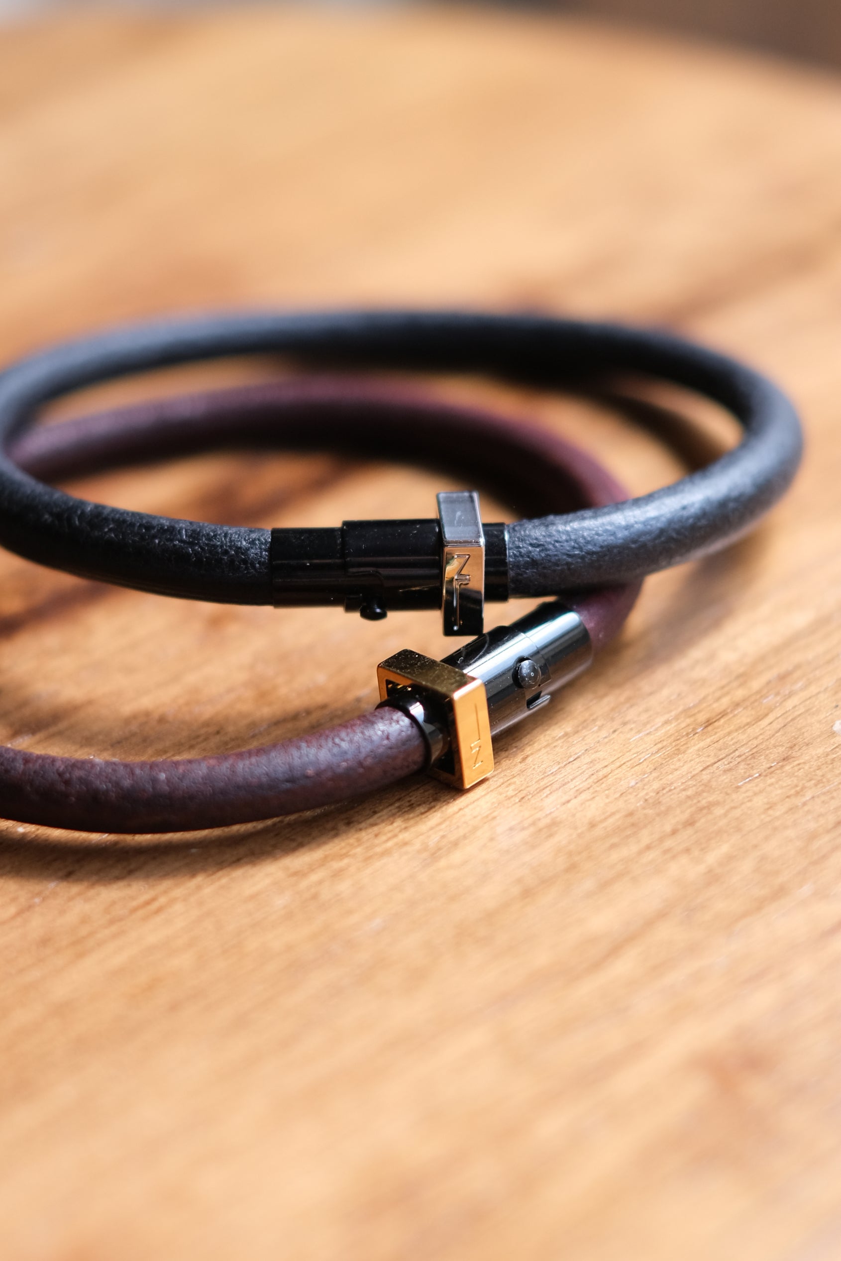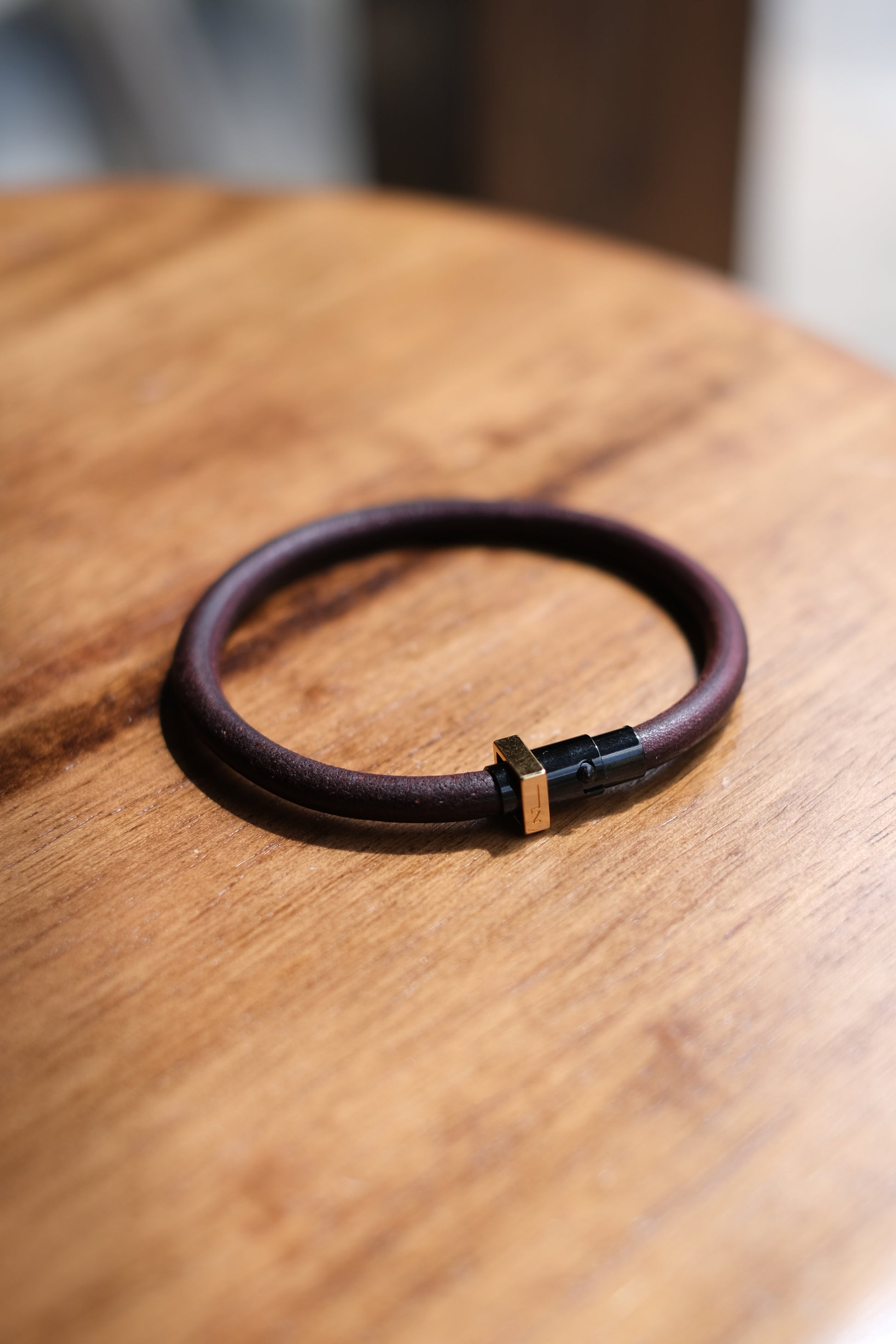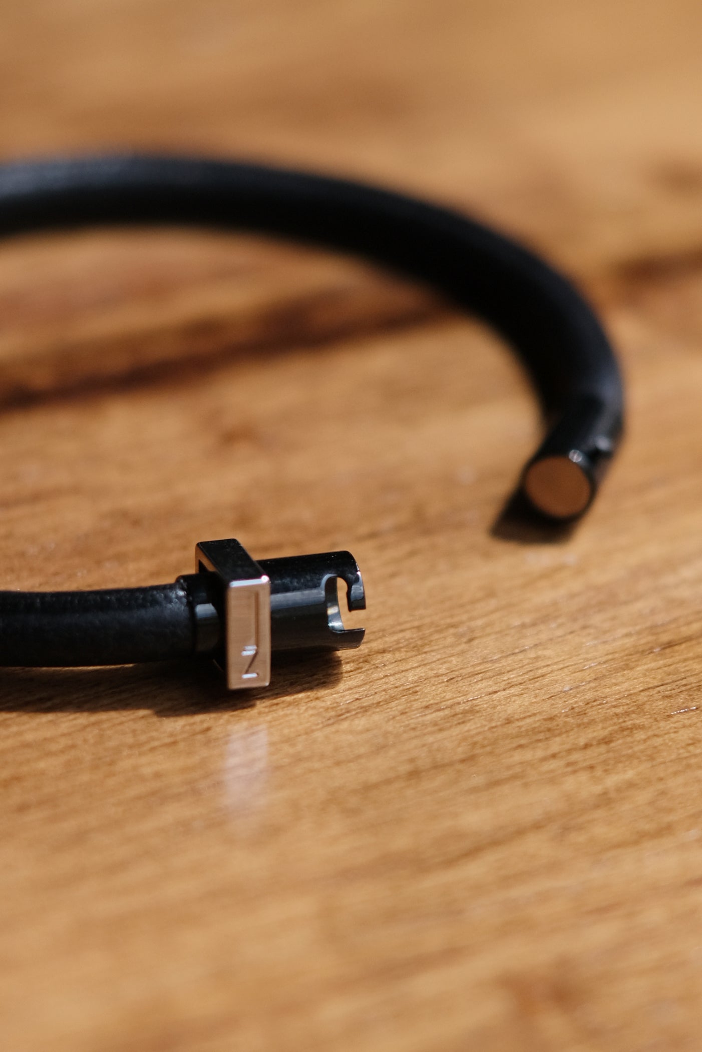 5mm幅のレザーコードを使用したレザーブレスレットです。接続部にはマグネットを用いているため着脱が容易になっています。(ひねって開閉するパーツになります) ネームパーツにNL刻印が入ります。