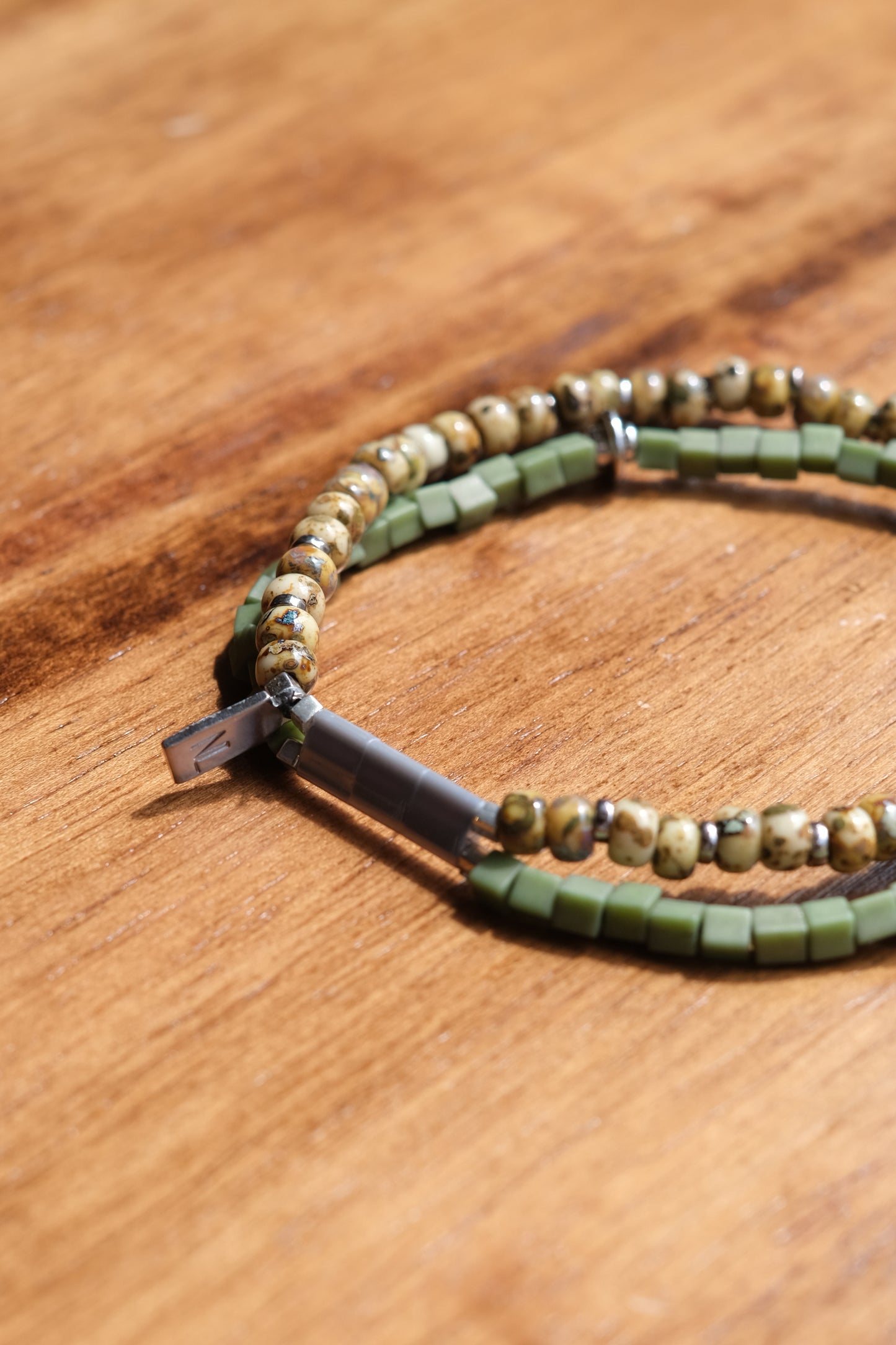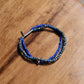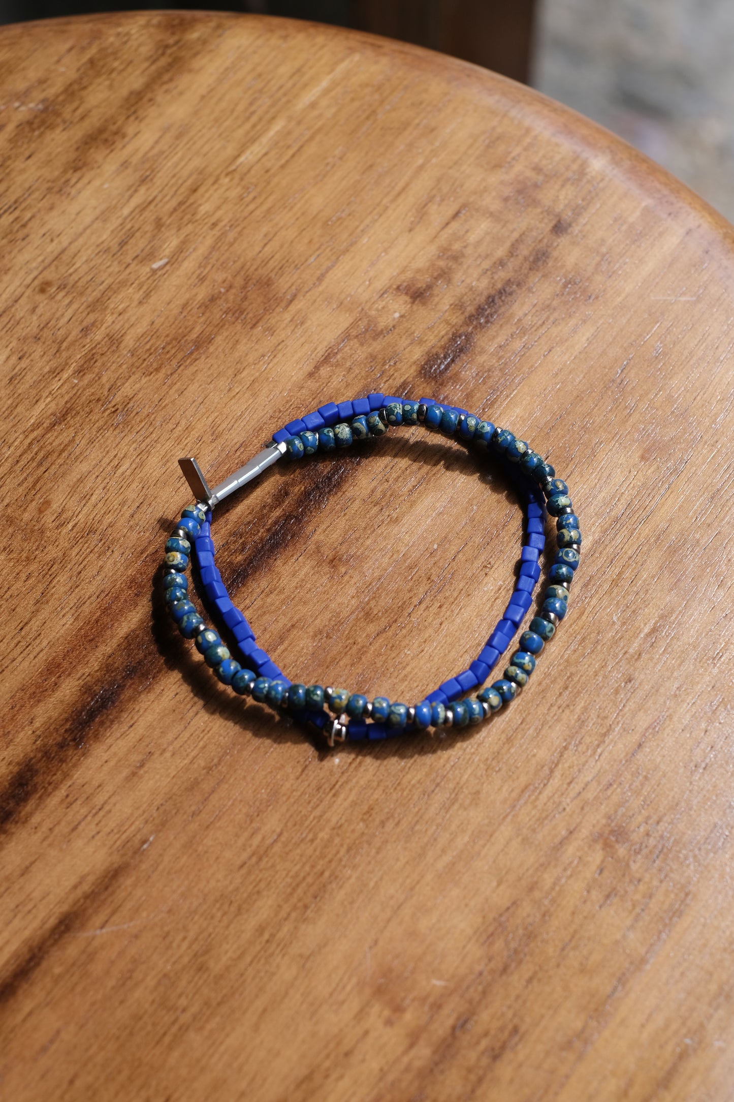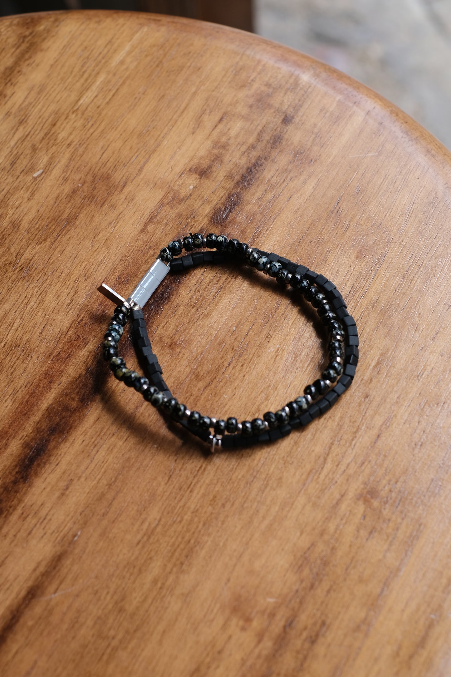 二重になるビーズを軸にスクエア型のガラスビー ズとトルコ産の丸型マーブルビーズに分かれているブレスレットです。 伸縮性のテグスを用いているため着脱が容易になっています。 ネームパーツにNL刻印が入ります。 レイヤード風に見えるのでコーディネートのアクセントにもオススメです。