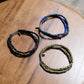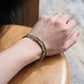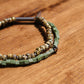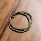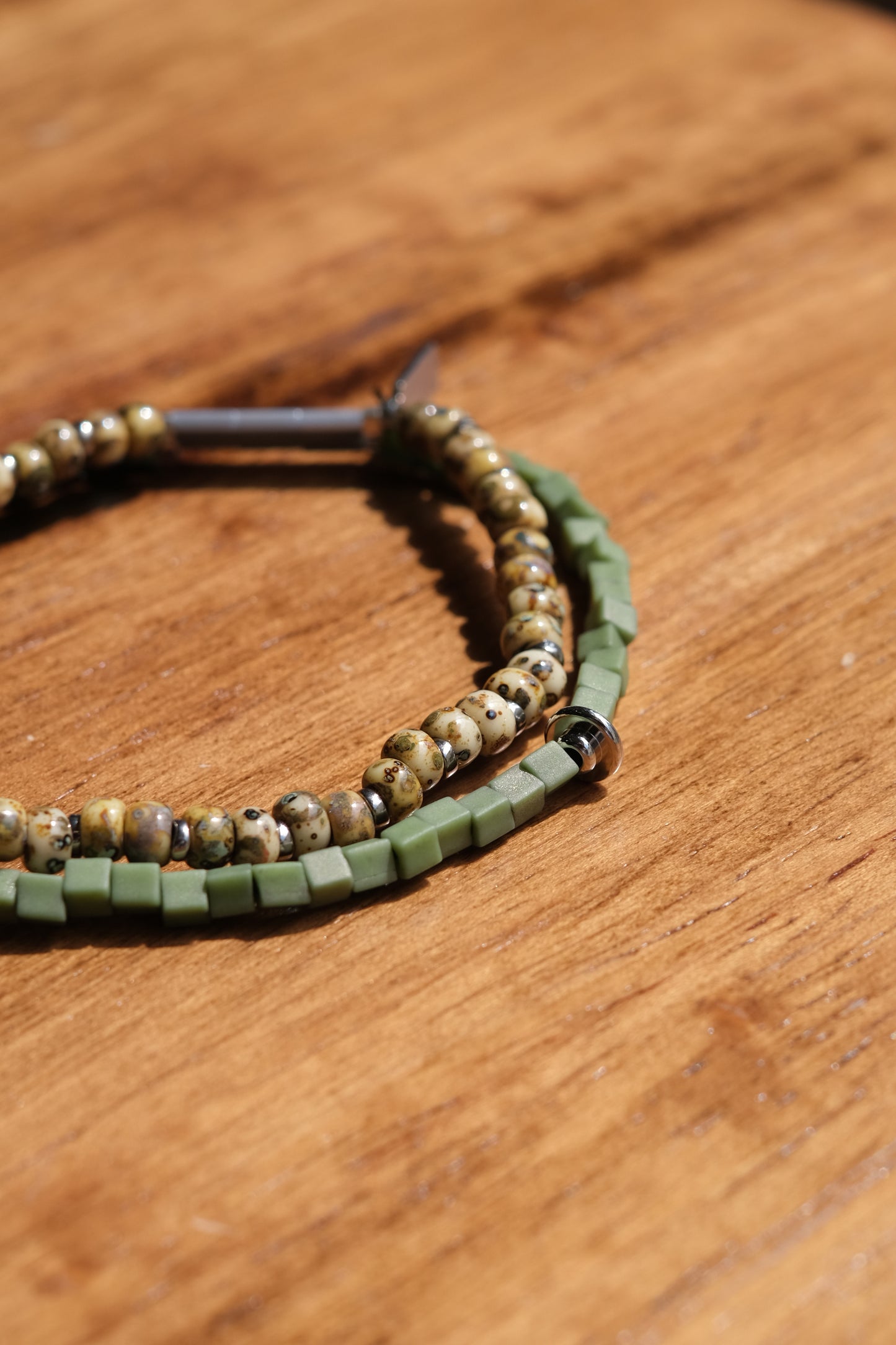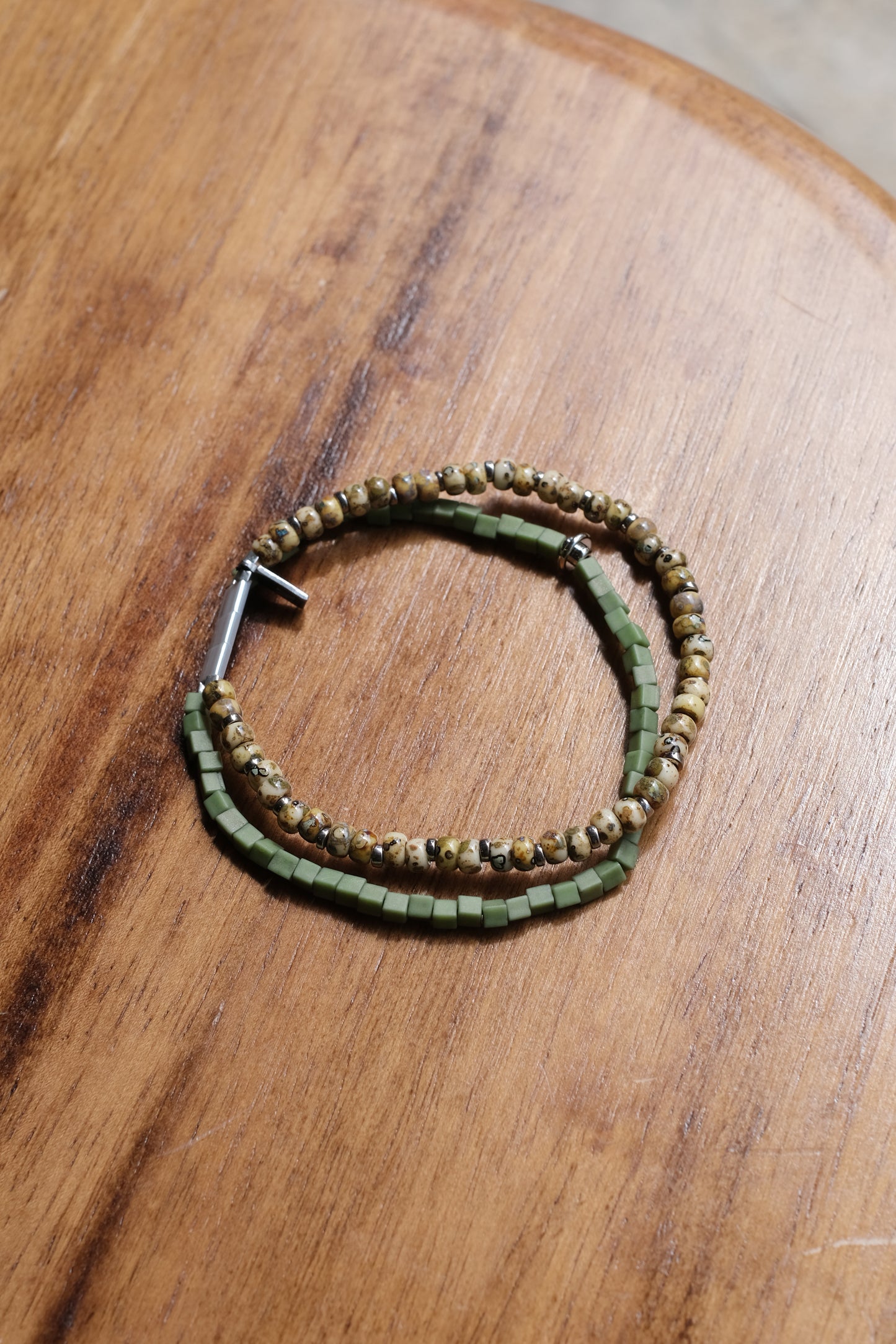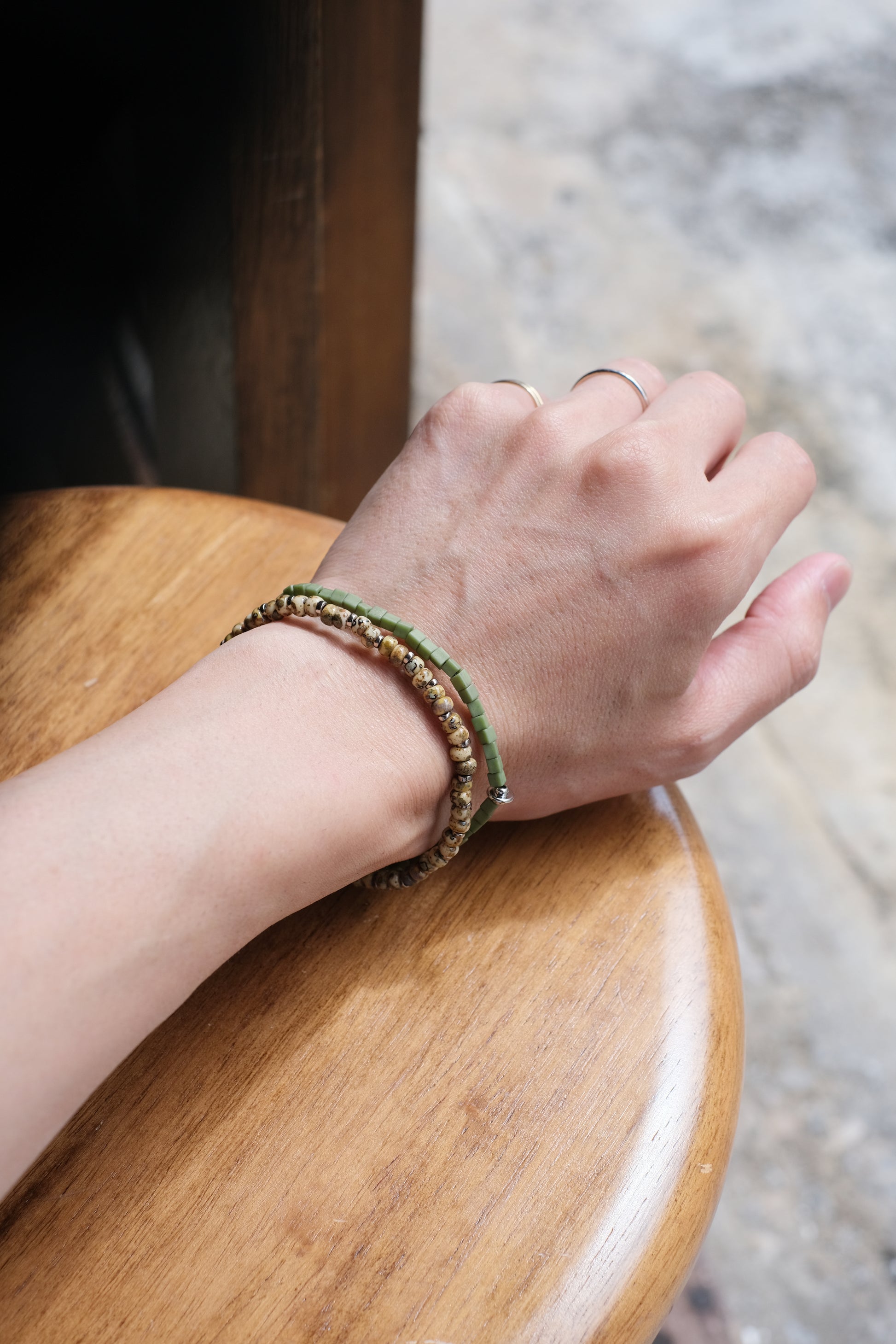 二重になるビーズを軸にスクエア型のガラスビー ズとトルコ産の丸型マーブルビーズに分かれているブレスレットです。 伸縮性のテグスを用いているため着脱が容易になっています。 ネームパーツにNL刻印が入ります。 レイヤード風に見えるのでコーディネートのアクセントにもオススメです。