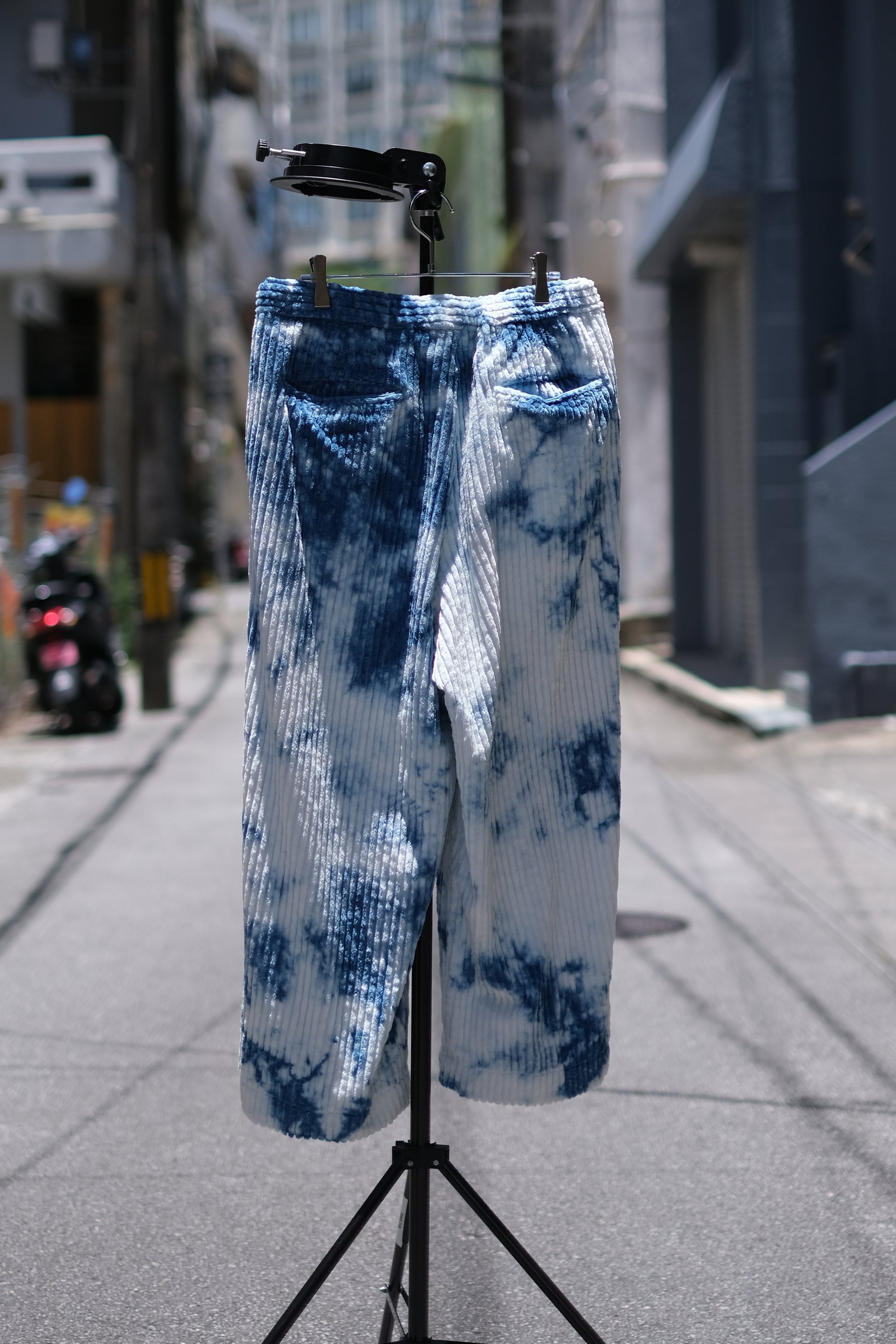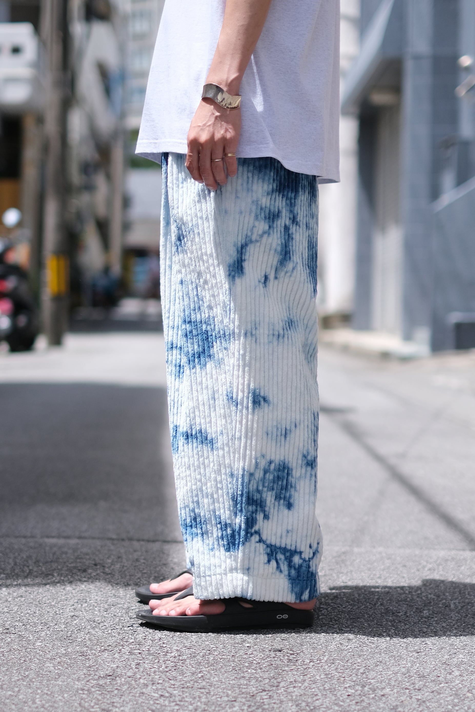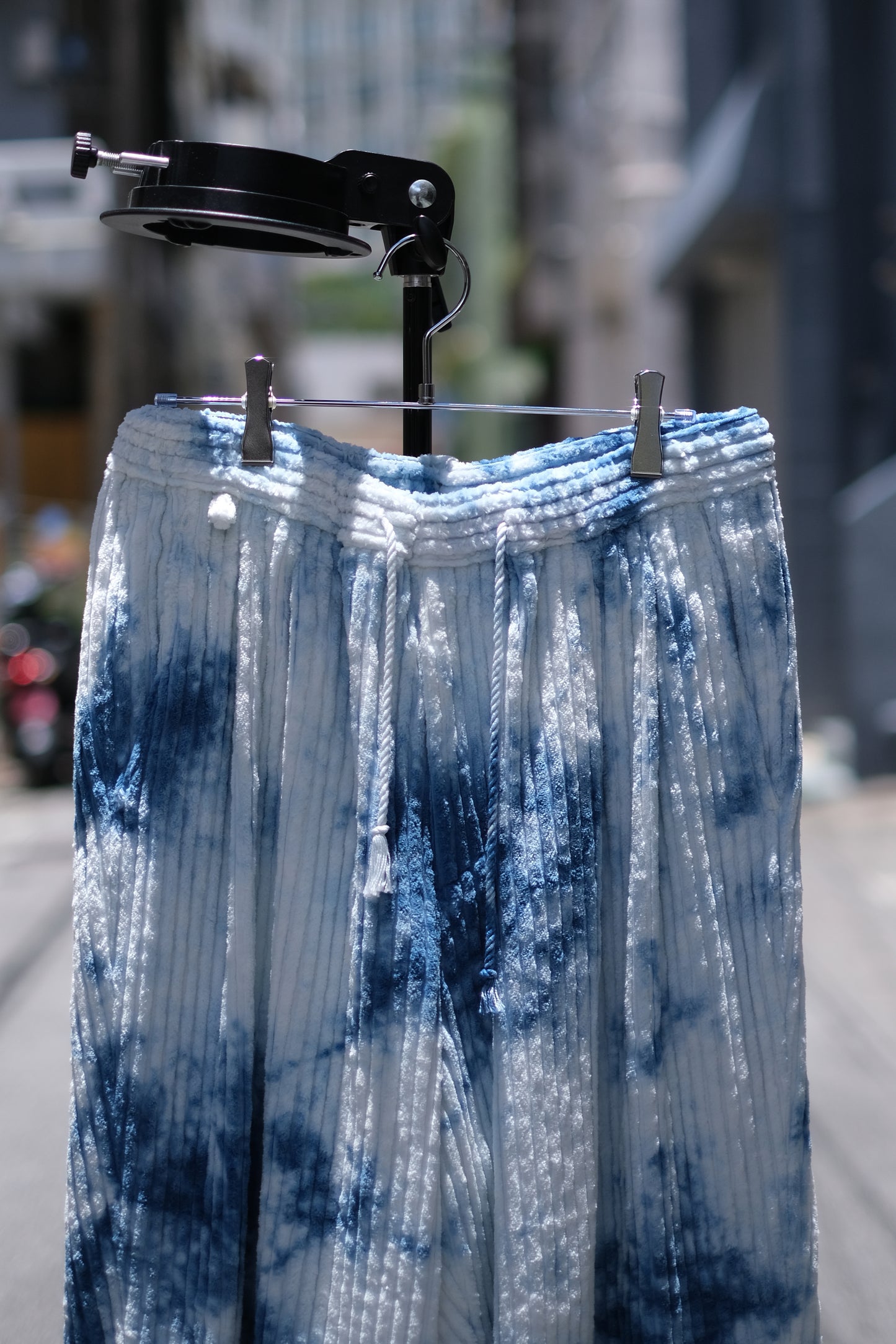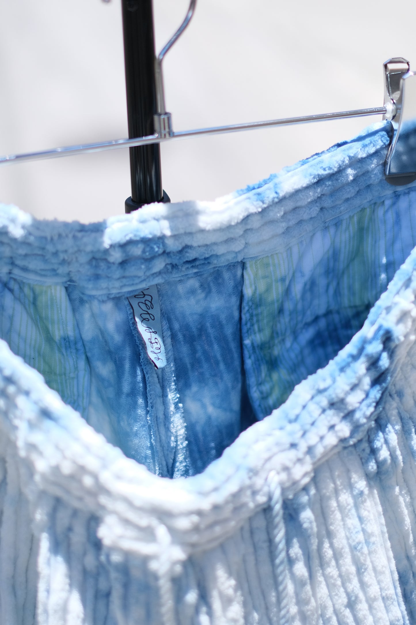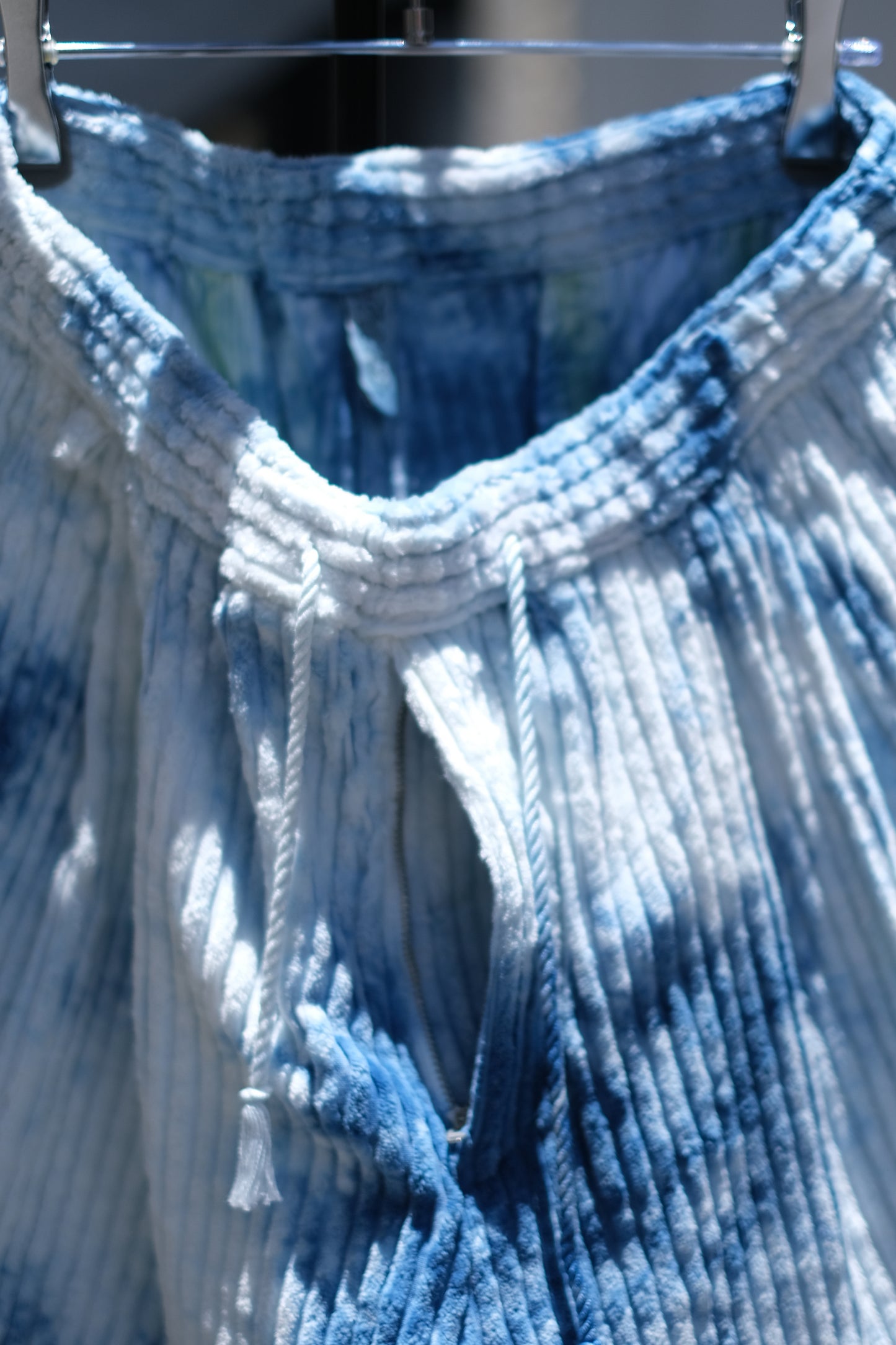 ボリューミーで毛足の長いコーデュロイ生地。エアータンブラーで仕上げされているので、ふっくらとしたタッチが気持ちいいです。奄美大島の草木染め、泥染めで有名な金井工芸さんで奄美大島の空色をテーマに藍で染めた爽やかなカラーの一本です。