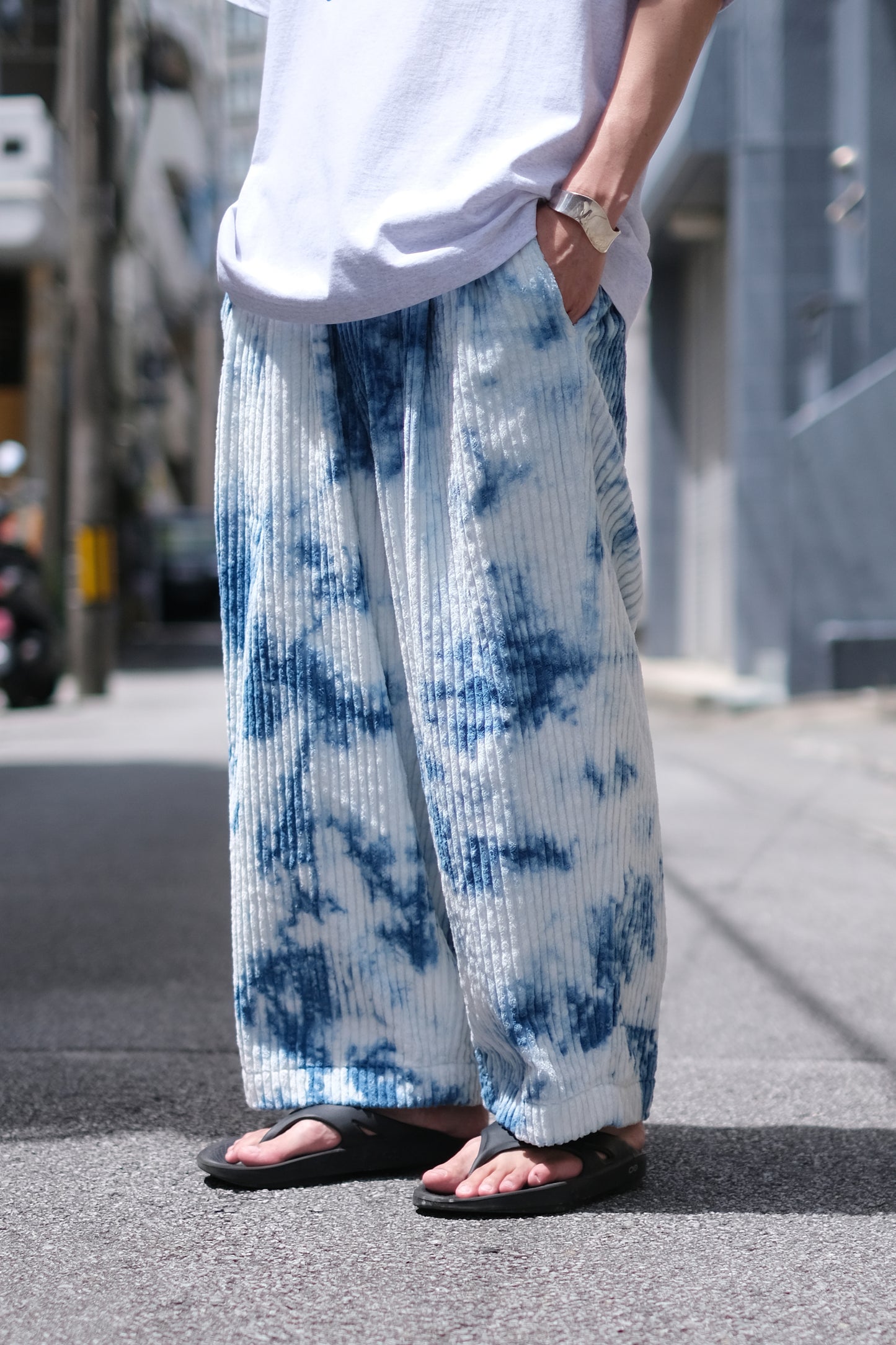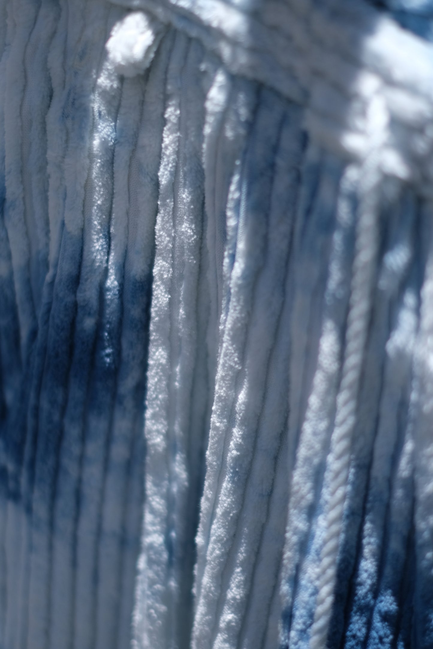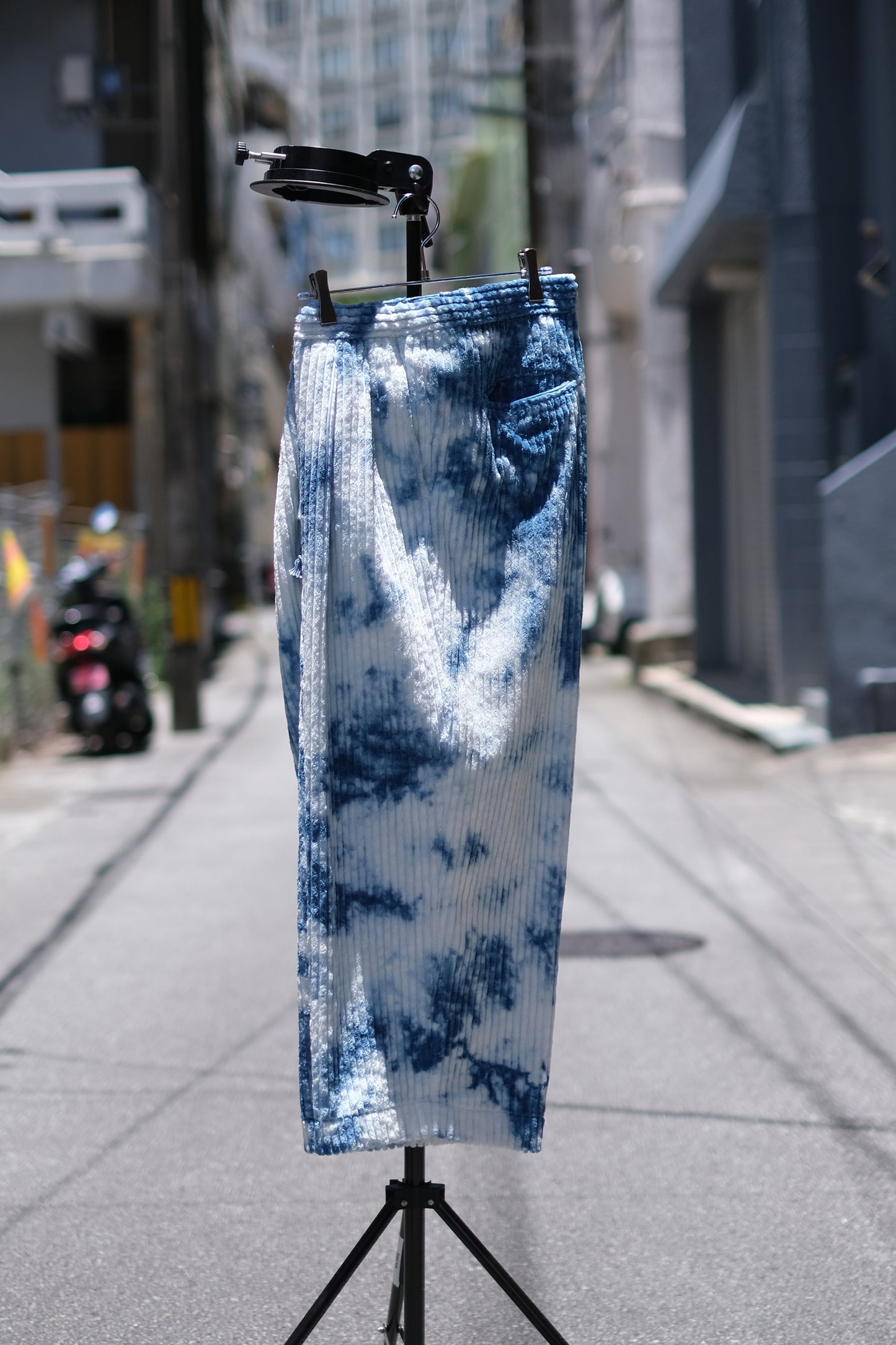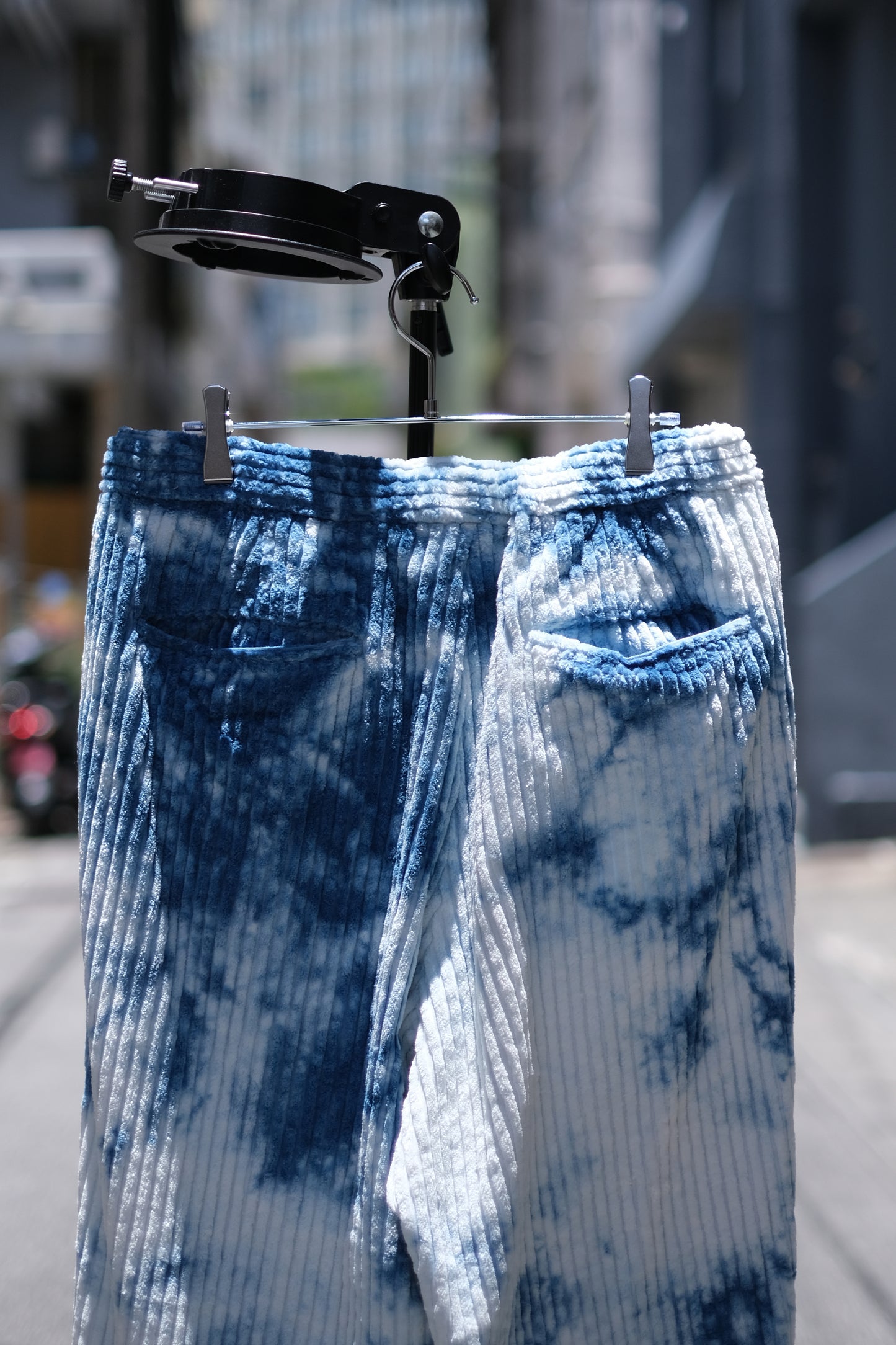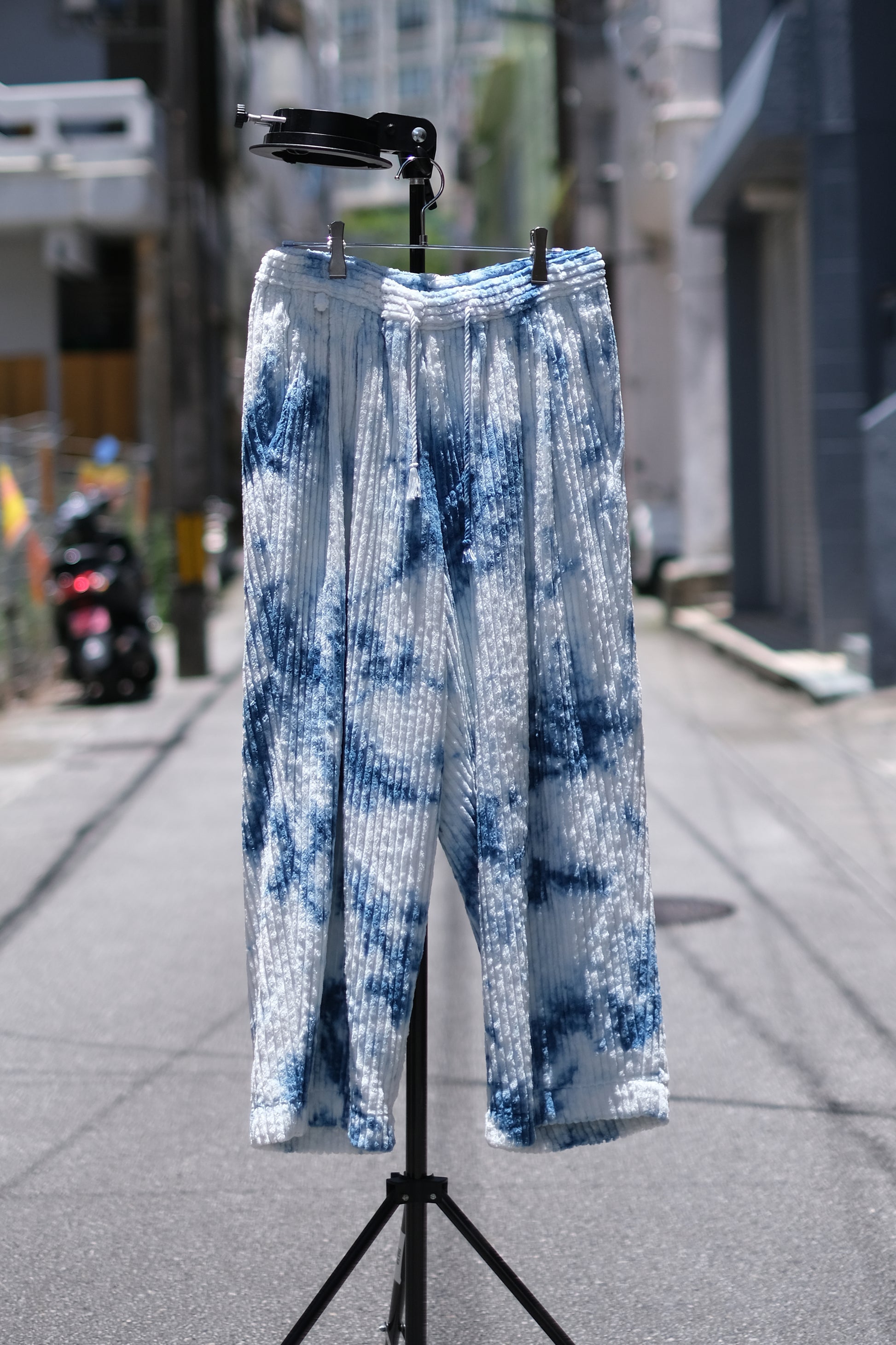 ボリューミーで毛足の長いコーデュロイ生地。エアータンブラーで仕上げされているので、ふっくらとしたタッチが気持ちいいです。奄美大島の草木染め、泥染めで有名な金井工芸さんで奄美大島の空色をテーマに藍で染めた爽やかなカラーの一本です。