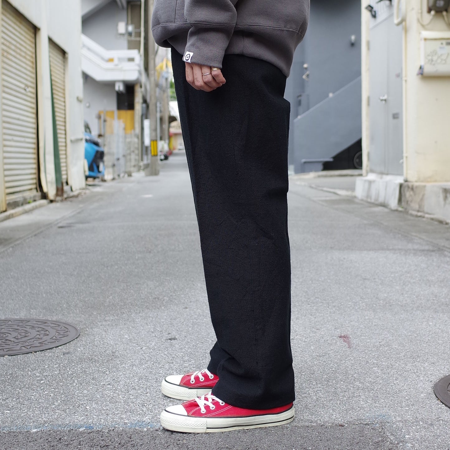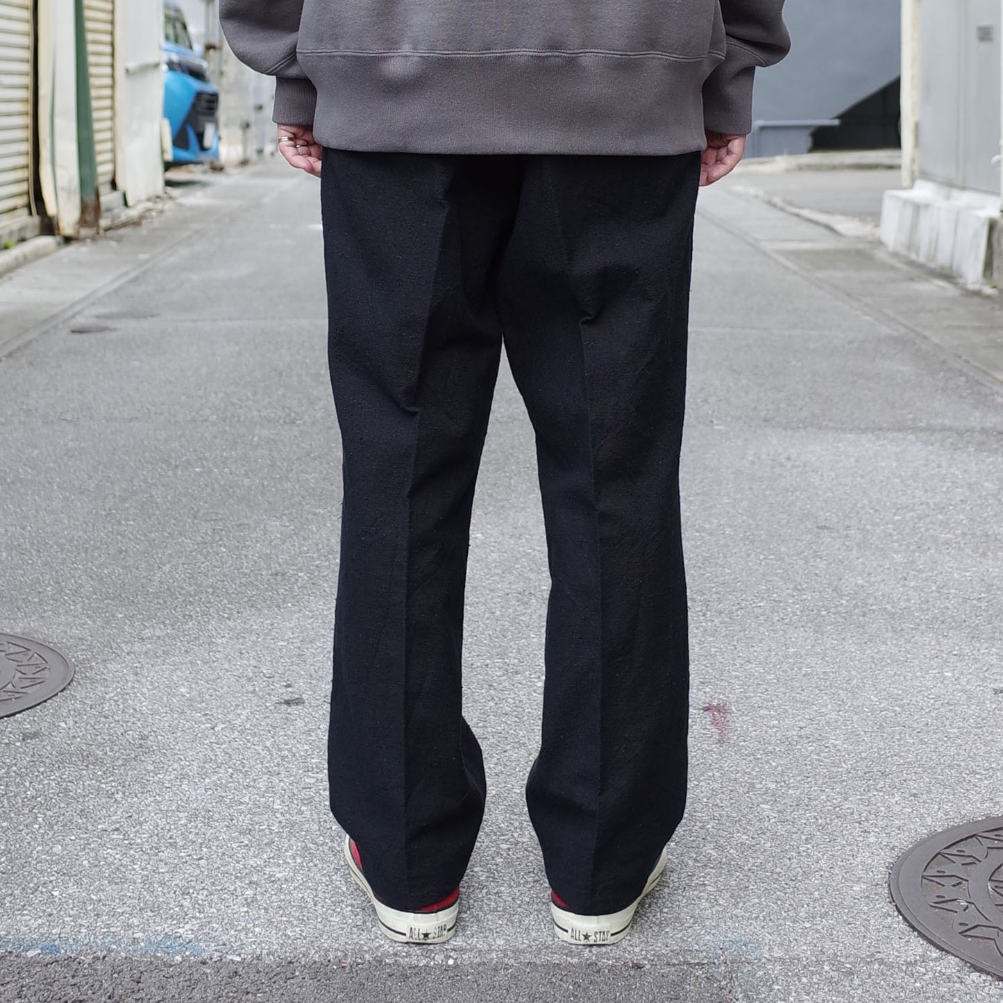 ストレートシルエットですが、イージーパンツに比べてシュッとした細さで上品に着用できる一本です。