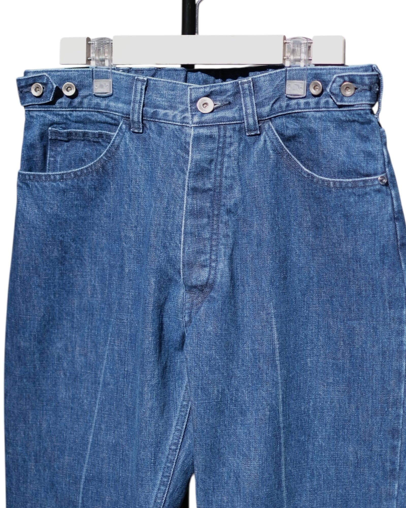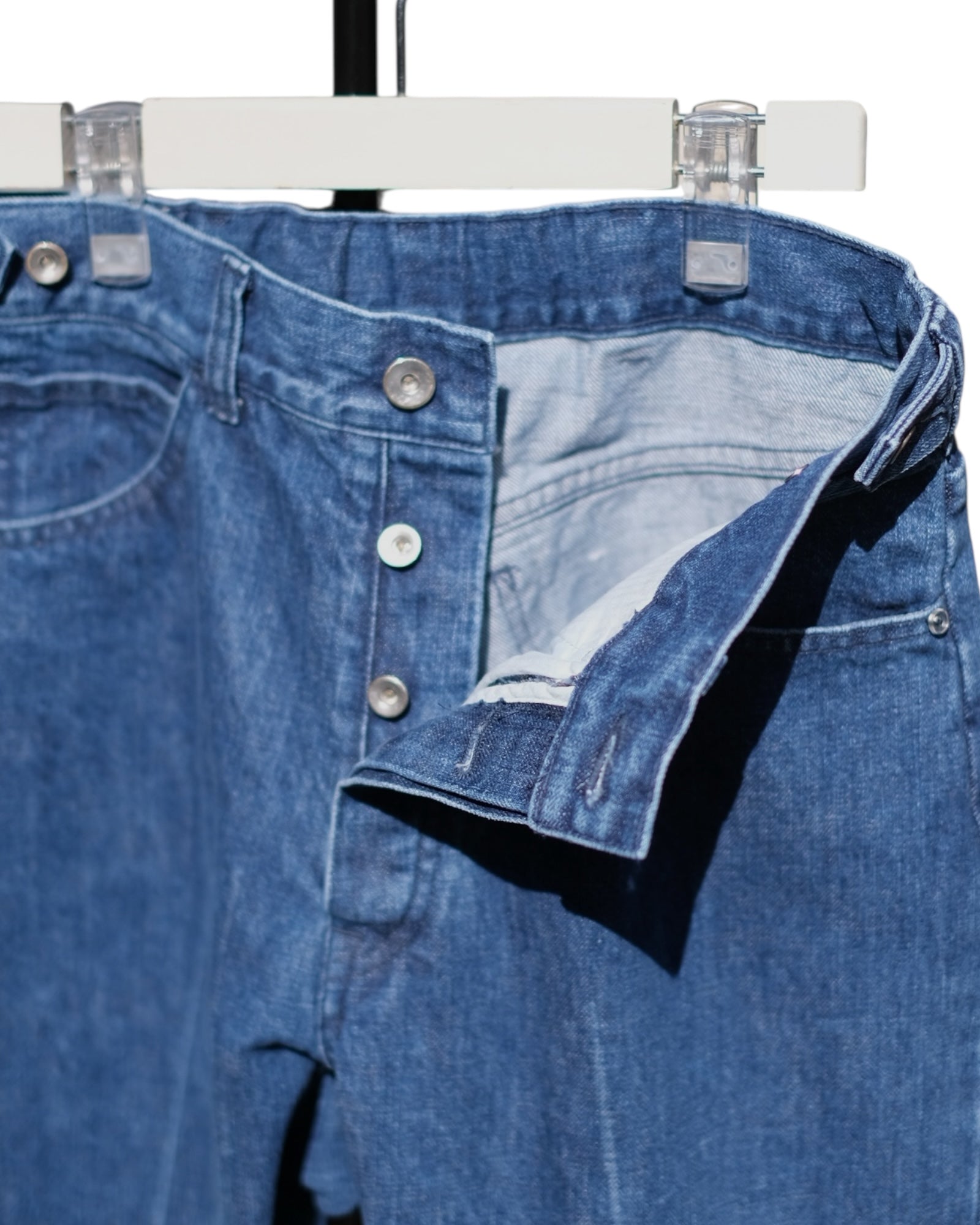 さりげないフレアラインが脚を美しく見せ、スタイルアップ効果も期待できます。コインポケットはスマートフォンが収まるサイズにアップデート。ウエスト両サイドには、タブ+ゴム仕様のアジャスターを配し、快適なフィット感とサイズ調整の自由度を実現しています。素材には、12オンスのドライサンフォ加工デニムを採用。これは、洗いや縮絨を行わずに機械的処理によって防縮性と生地の安定性を確保した特殊加工で、綾目(ツイル)のコントラストが際立つのが特徴です。穿き込むことで「ヒゲ」や「アタリ」といった経年変化が表れやすく、立体感ある表情を楽しめます。着用を重ねるほどに味わいが深まります。