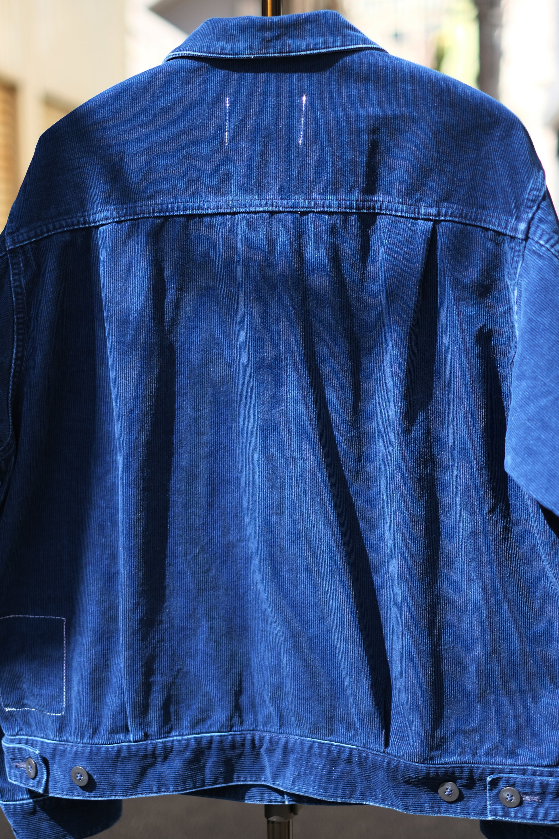 某デニムブランドのタイプ2モデルへのオマージュとしてデザインしたトラッカージャケットです。基本的なデザインは踏襲しつつ、シルエットのボリューム感を調整し、前開きのボタン間隔や胸ポケットの位置を低めに配置するなどのアレンジを加えています。素材は端境期にも最適な14ウェルのコーデュロイ生地を採用。ちょうどいい厚みの生地感で通年で着用できます。インディゴ染め&ストーンバイオ加工による独特なあたり感を演出しています。