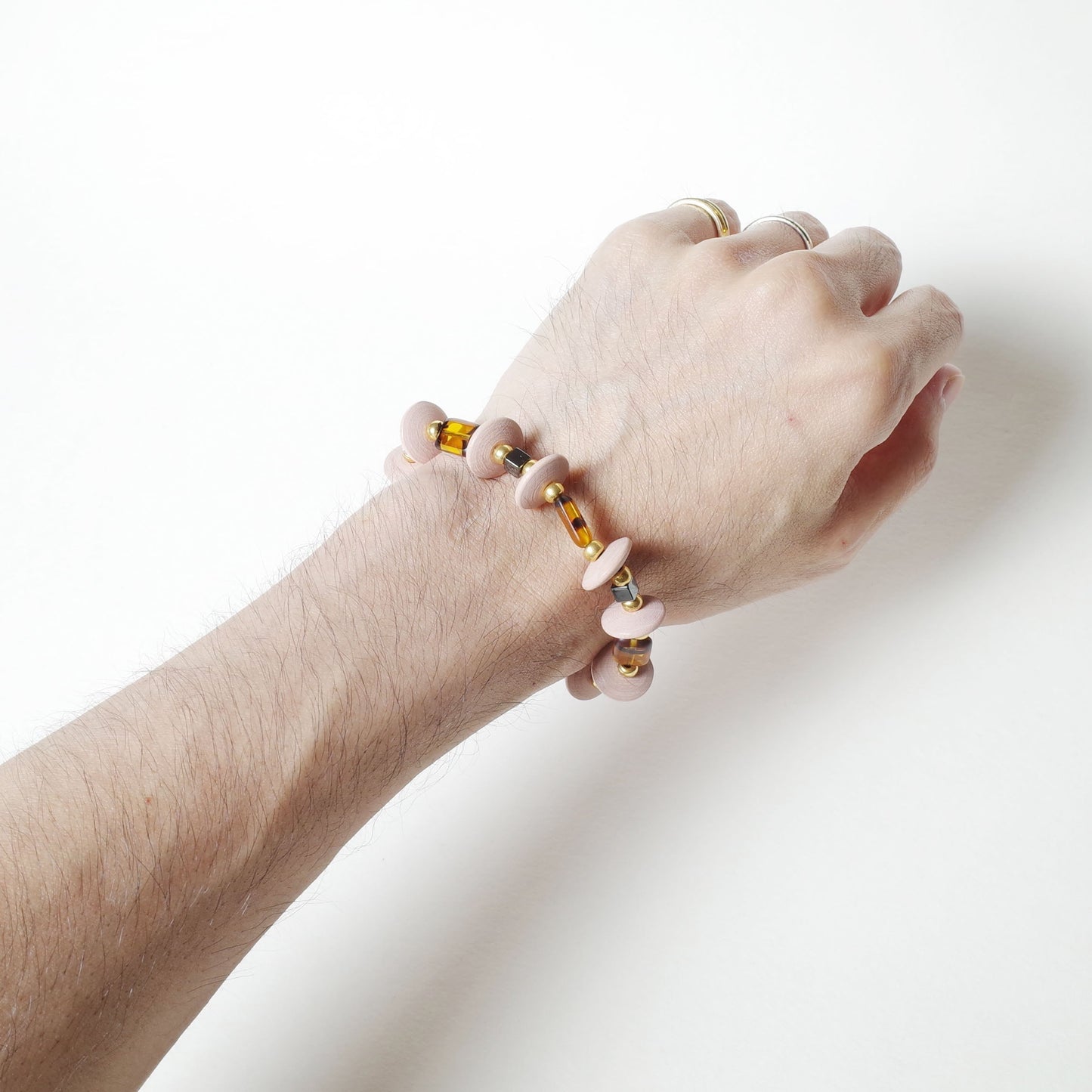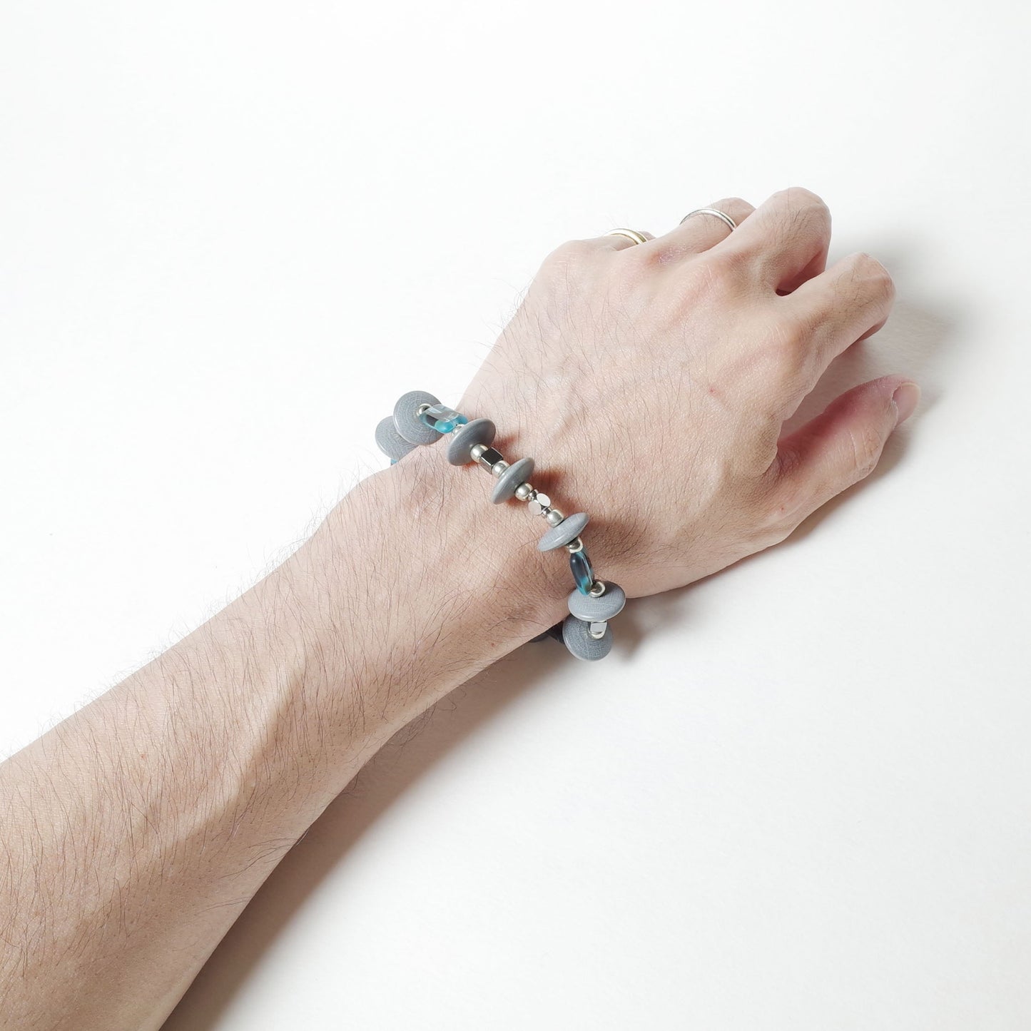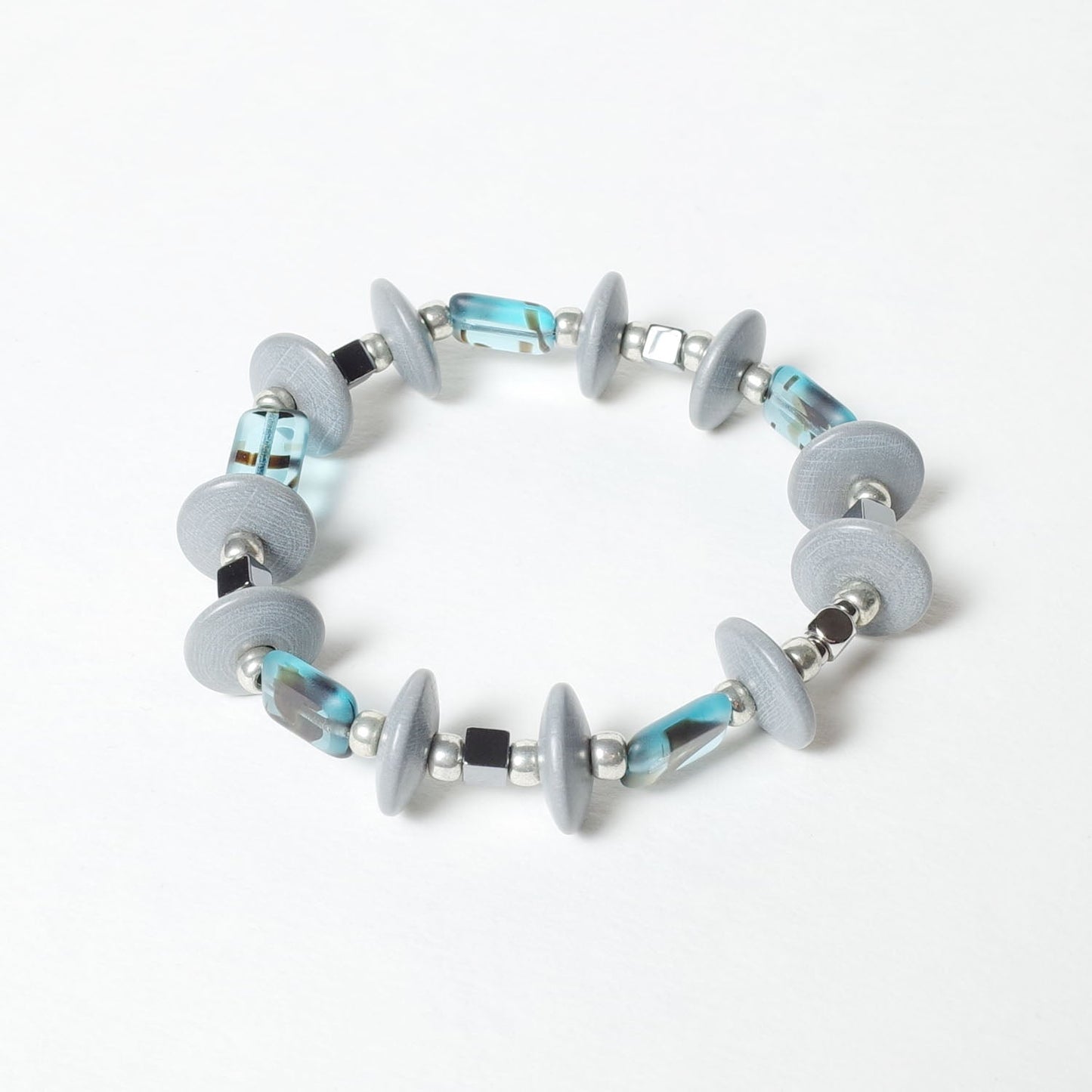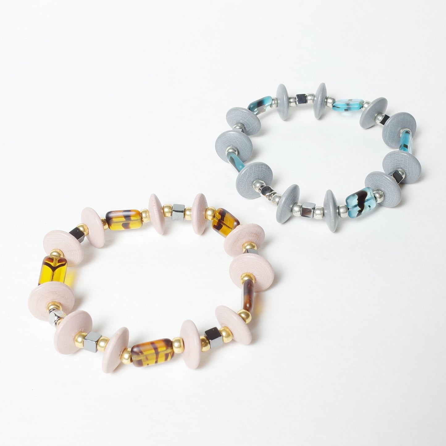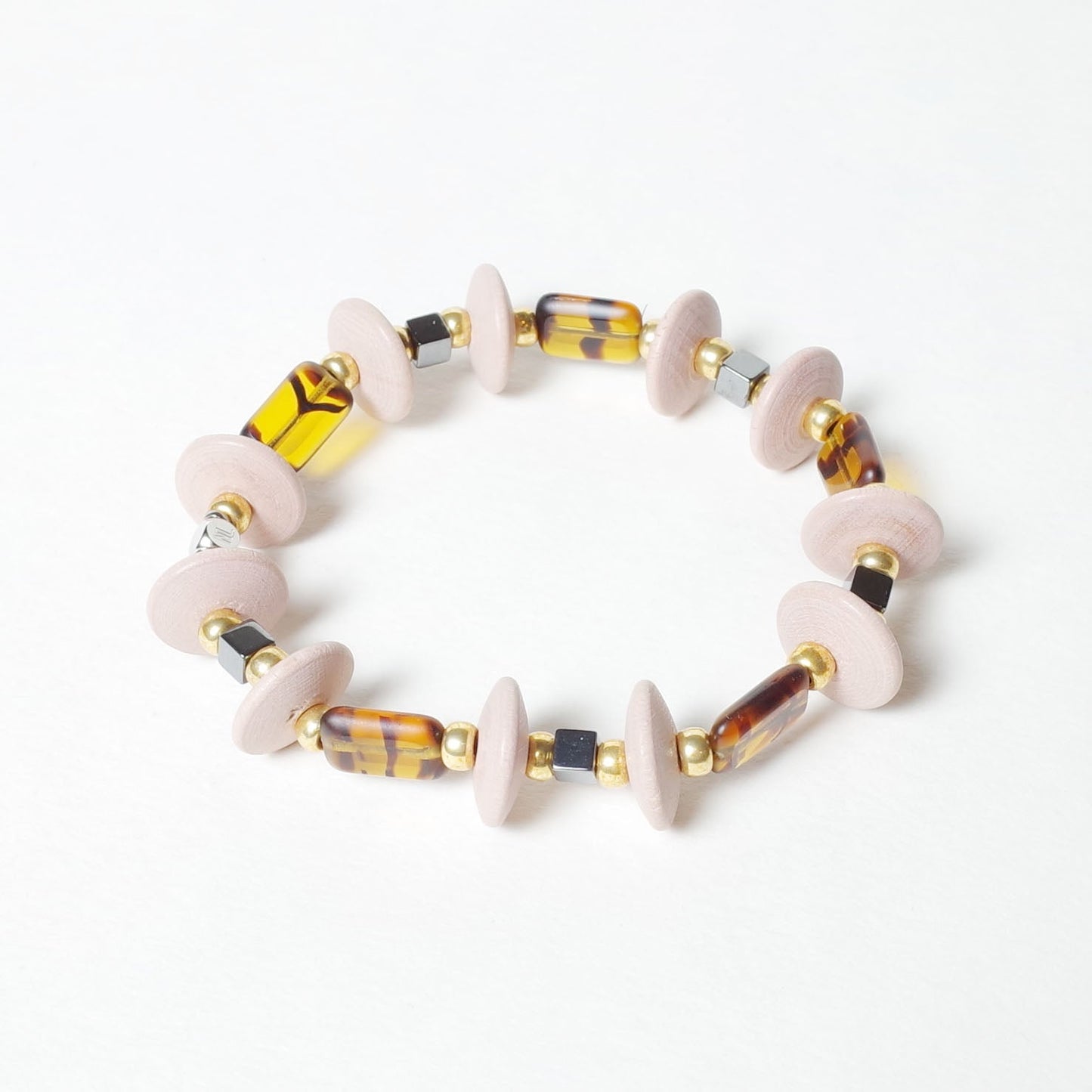 円盤形のウッドビーズにスクエア型のストーンを入れ、デザイン性のあるブレスレットに仕上げました。ボリュームがあるので一つつけるだけでも手元を飾ってくれるアイテムです。