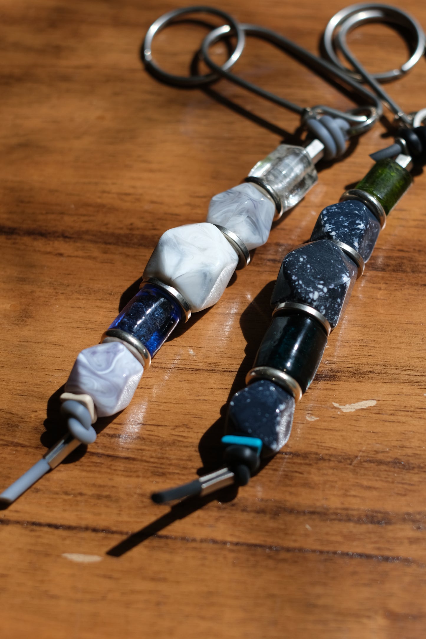 特徴的な形で様々な色のビーズと金具を組み合わせています。
