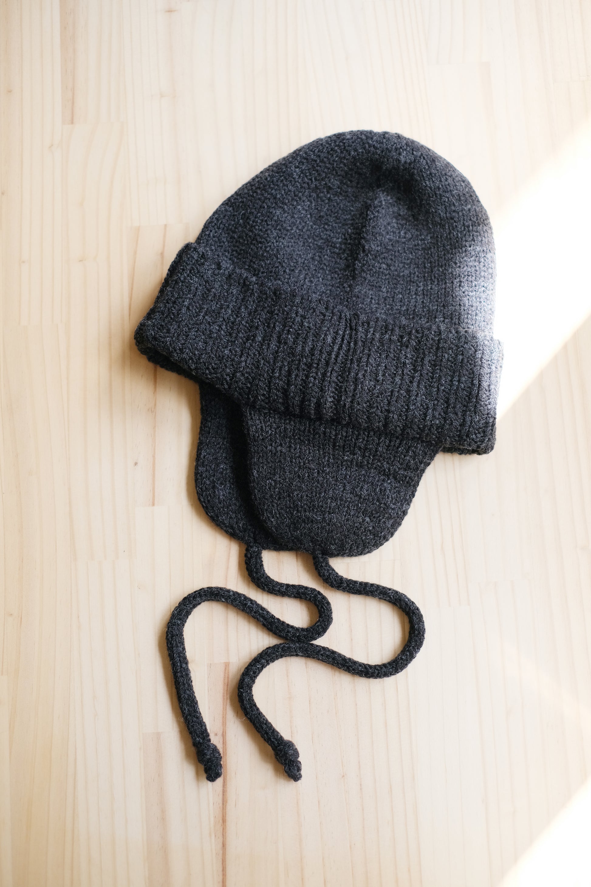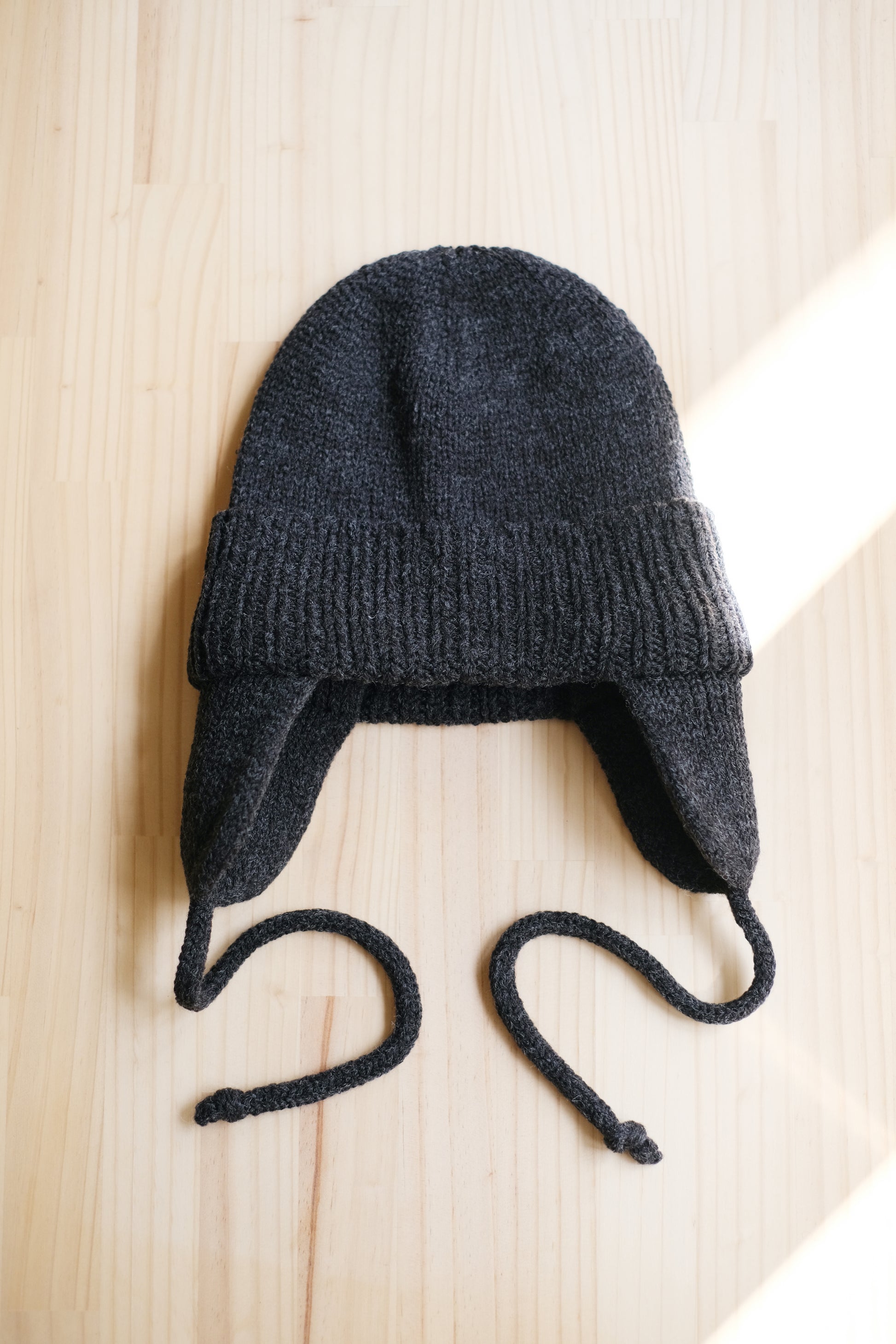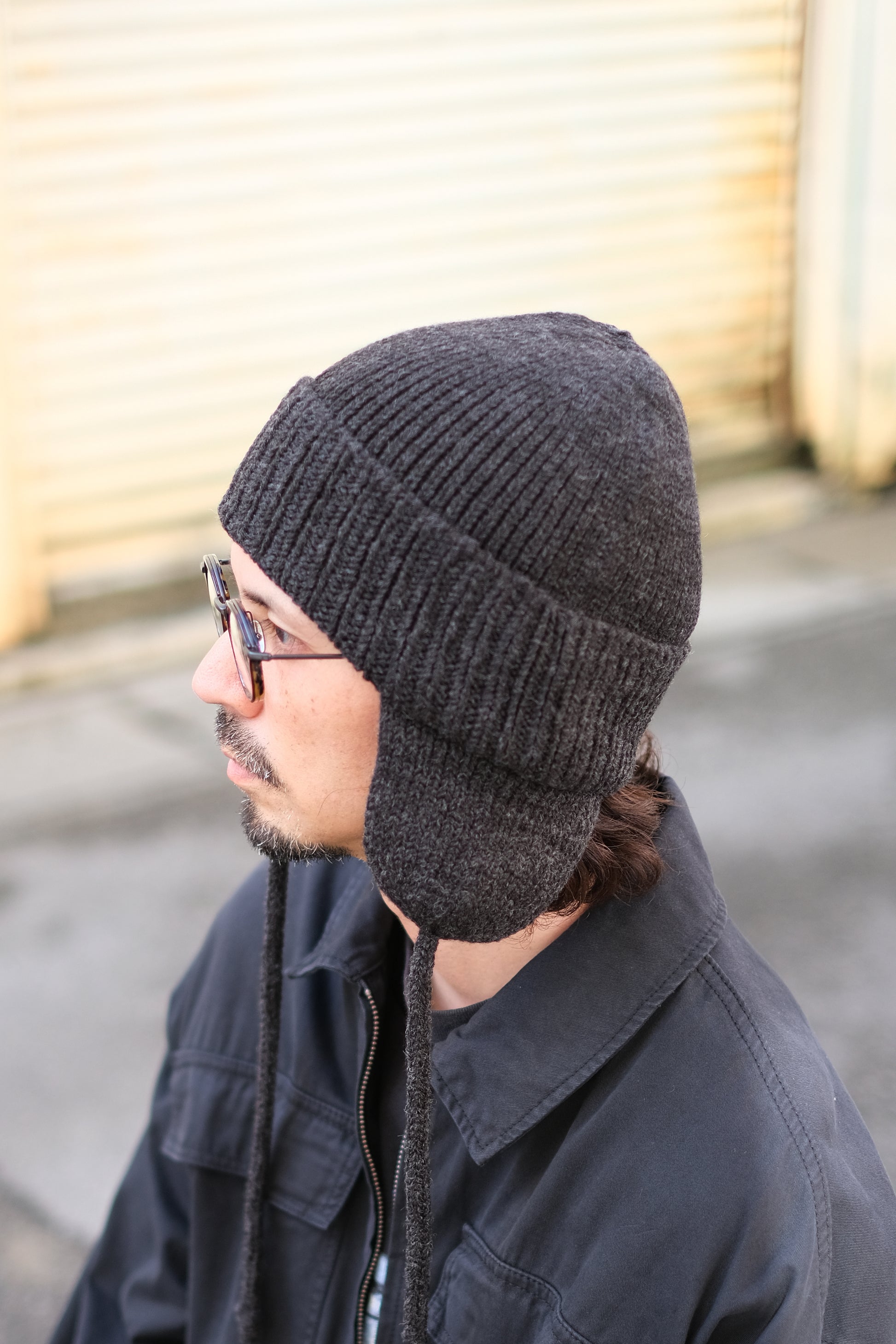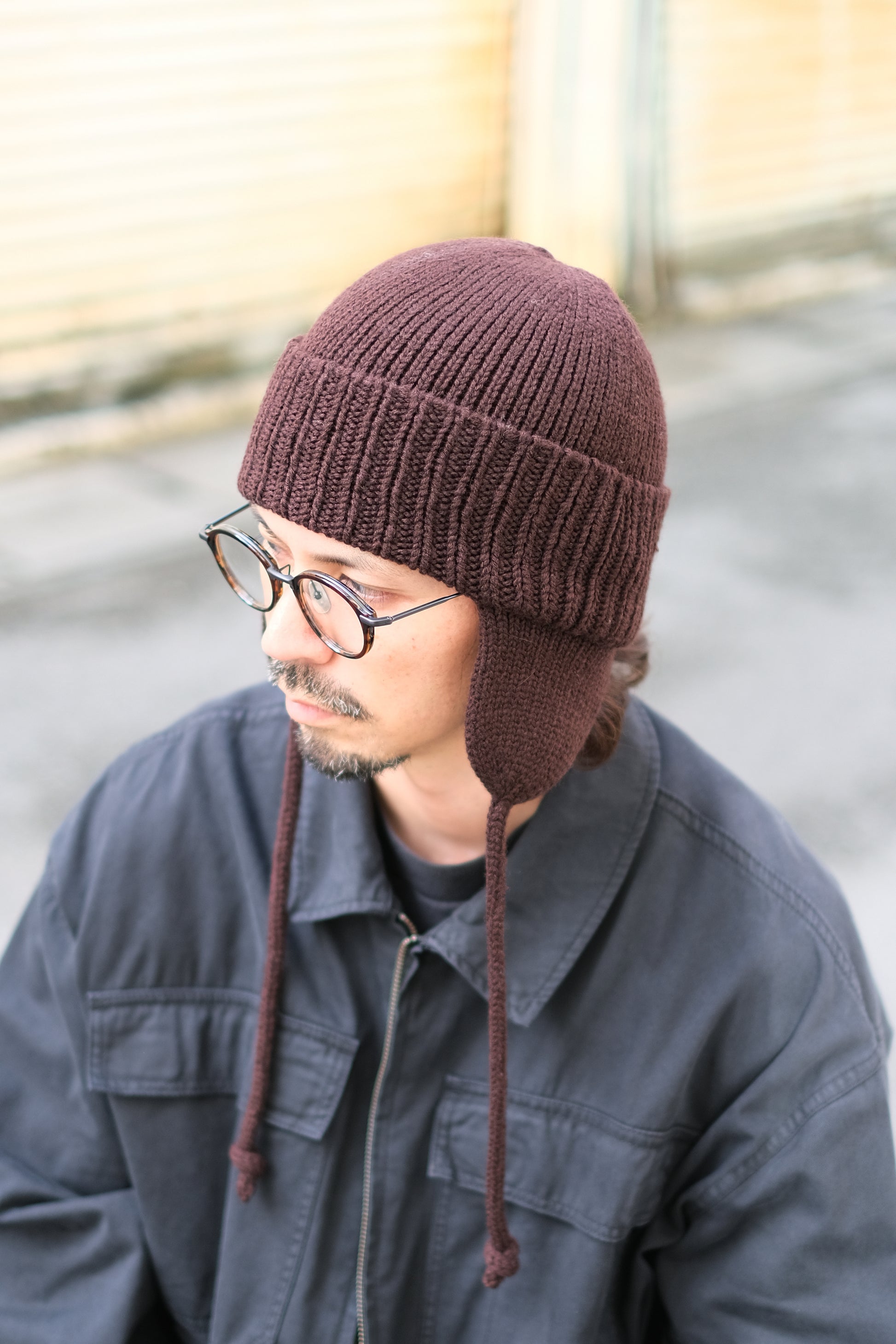 耳当て付きのニットワッチです。ソフトなミドルからローゲージ程のニット編み立てで、優しい被り心地です。十分なボリュームがあり柔らかな糸で丸みのあるシルエットです。スピンドルコードを上部で結びフライトキャップのようにアレンジすることも可能。コーディネートとのバランスでお楽しみください。