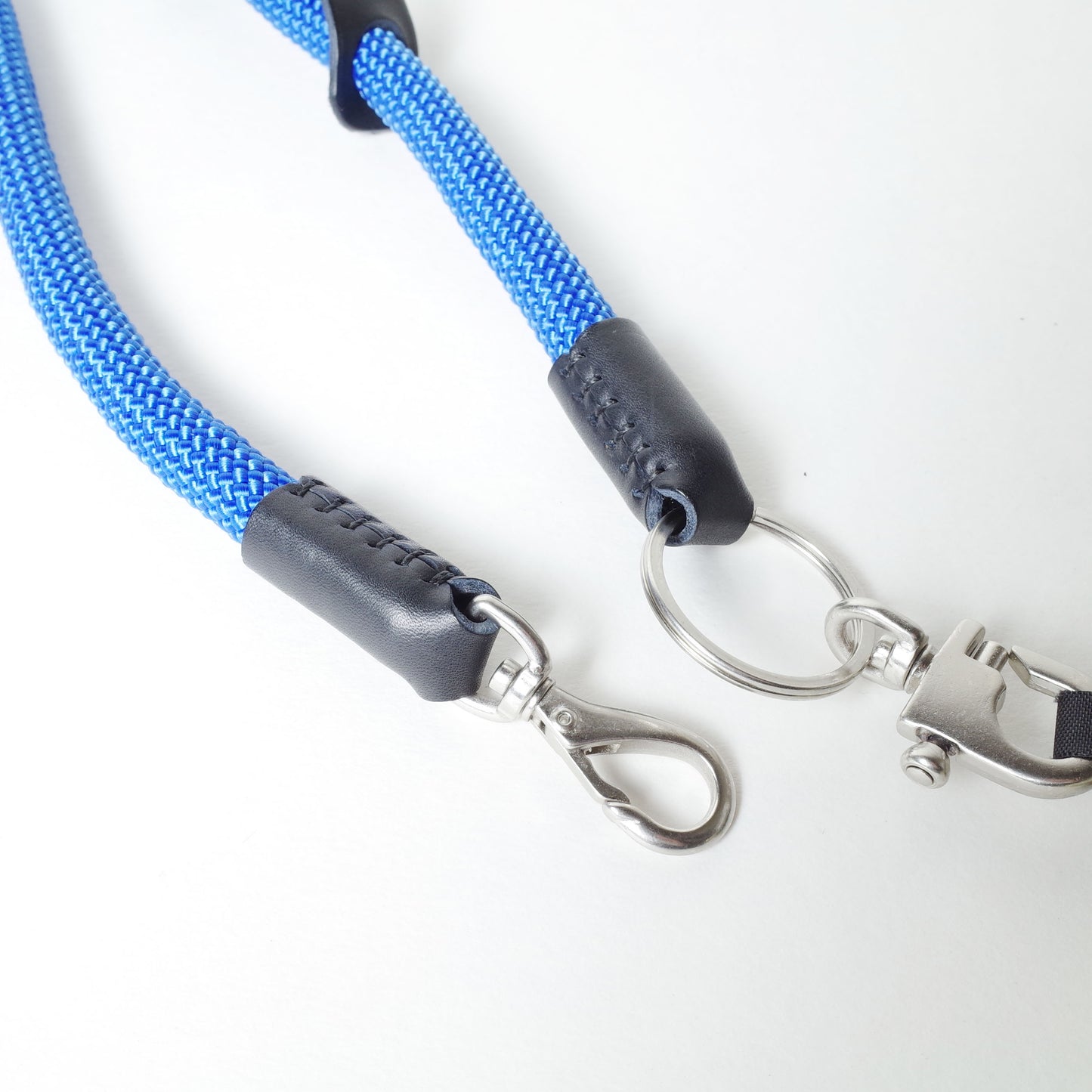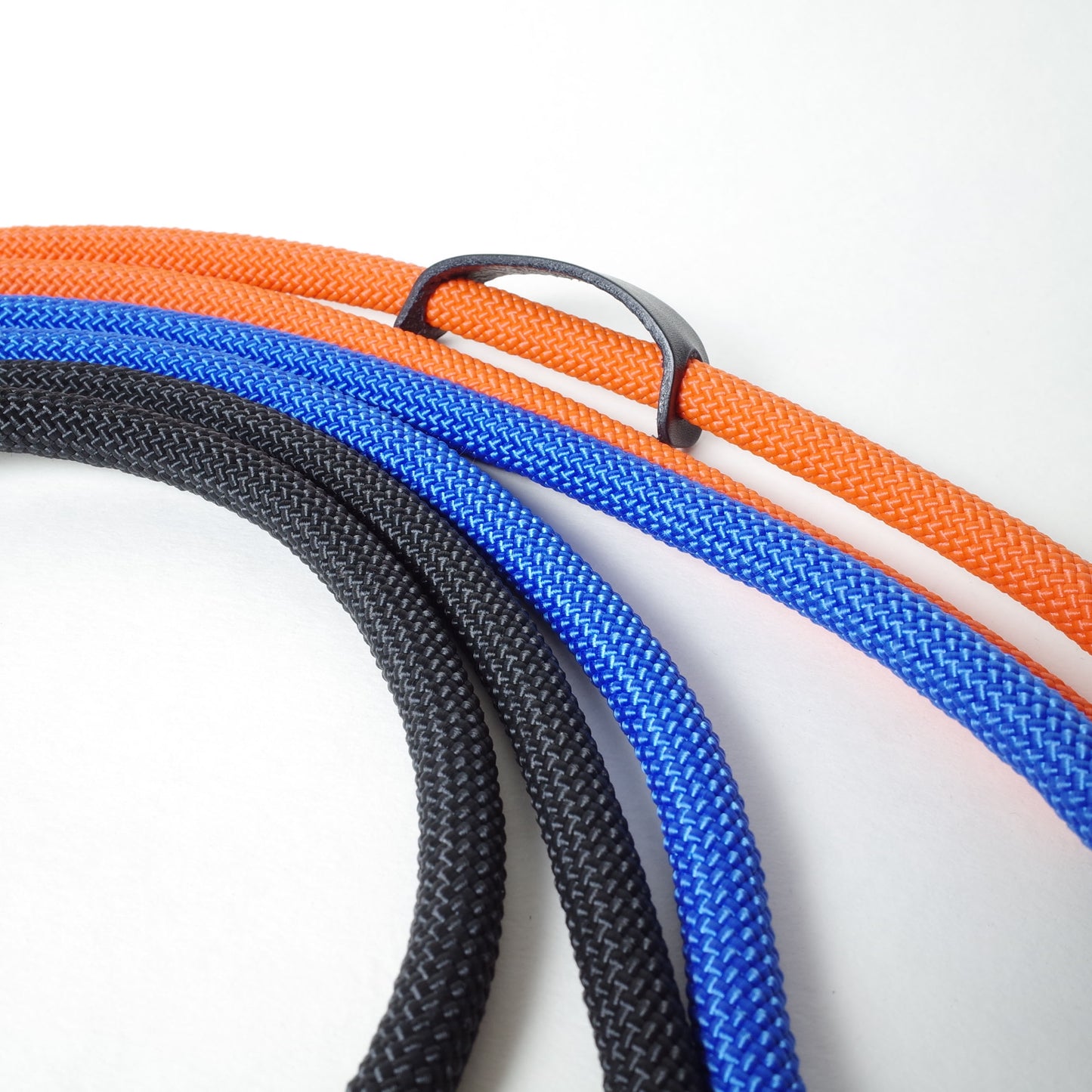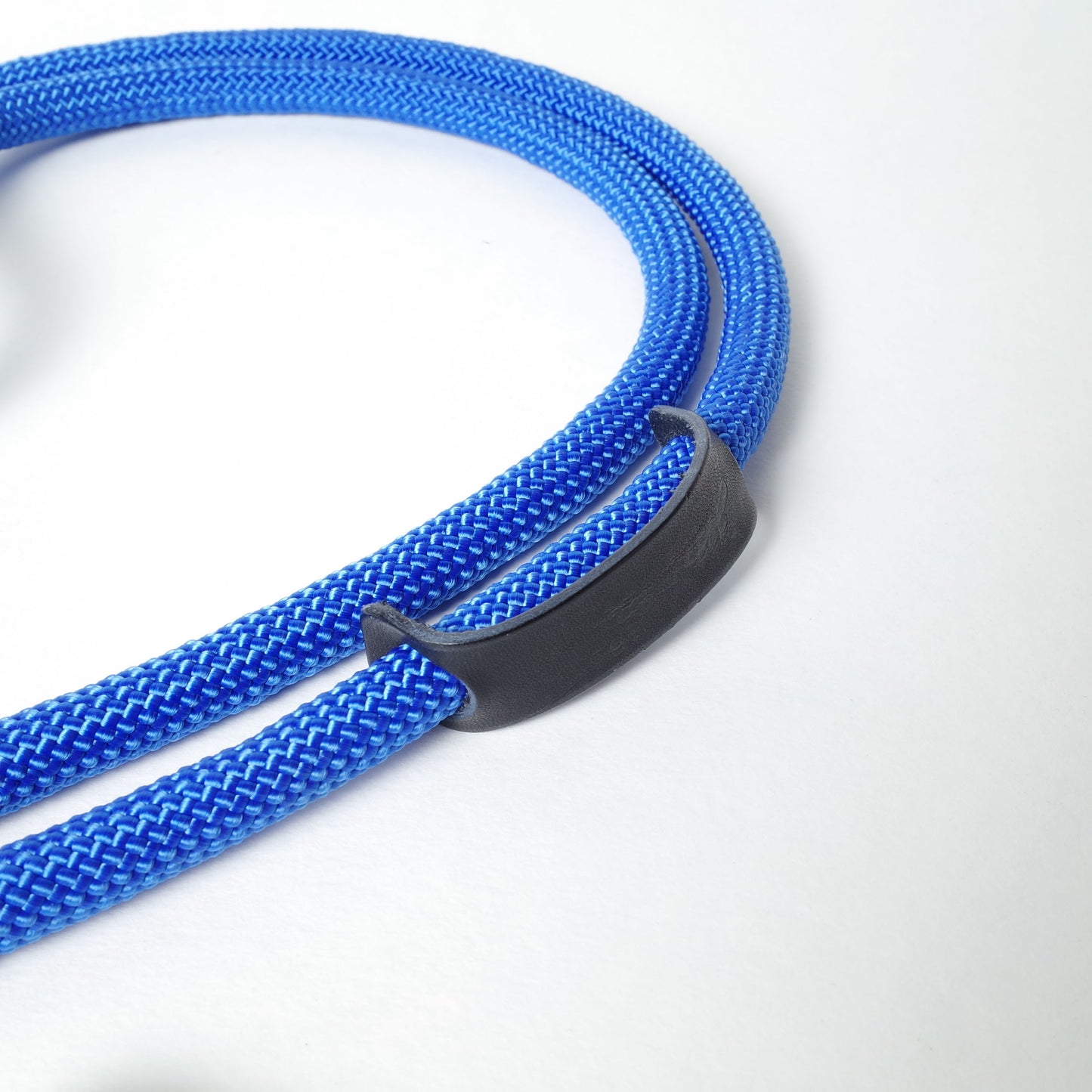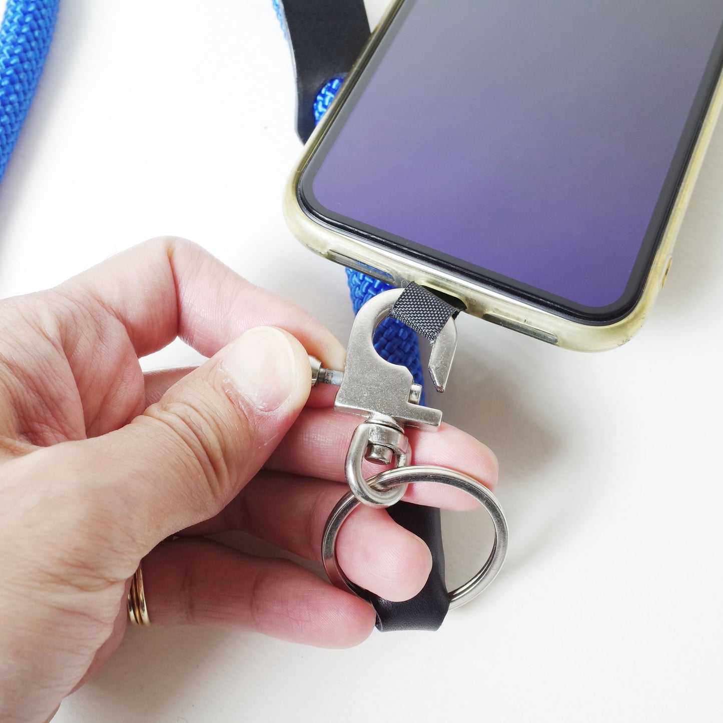 12mmの太いクライミングロープを使用したモバイルストラップです。 先端部分はレザー職人による手作業での始末でキレイな仕上がりになっています。 カラビナ部分は両端に一個ずつ付いています。 付属のアタッチメントをスマホケースとスマホの間に差し込み、充電口から出してカラビナを引っ掛ける仕様です。